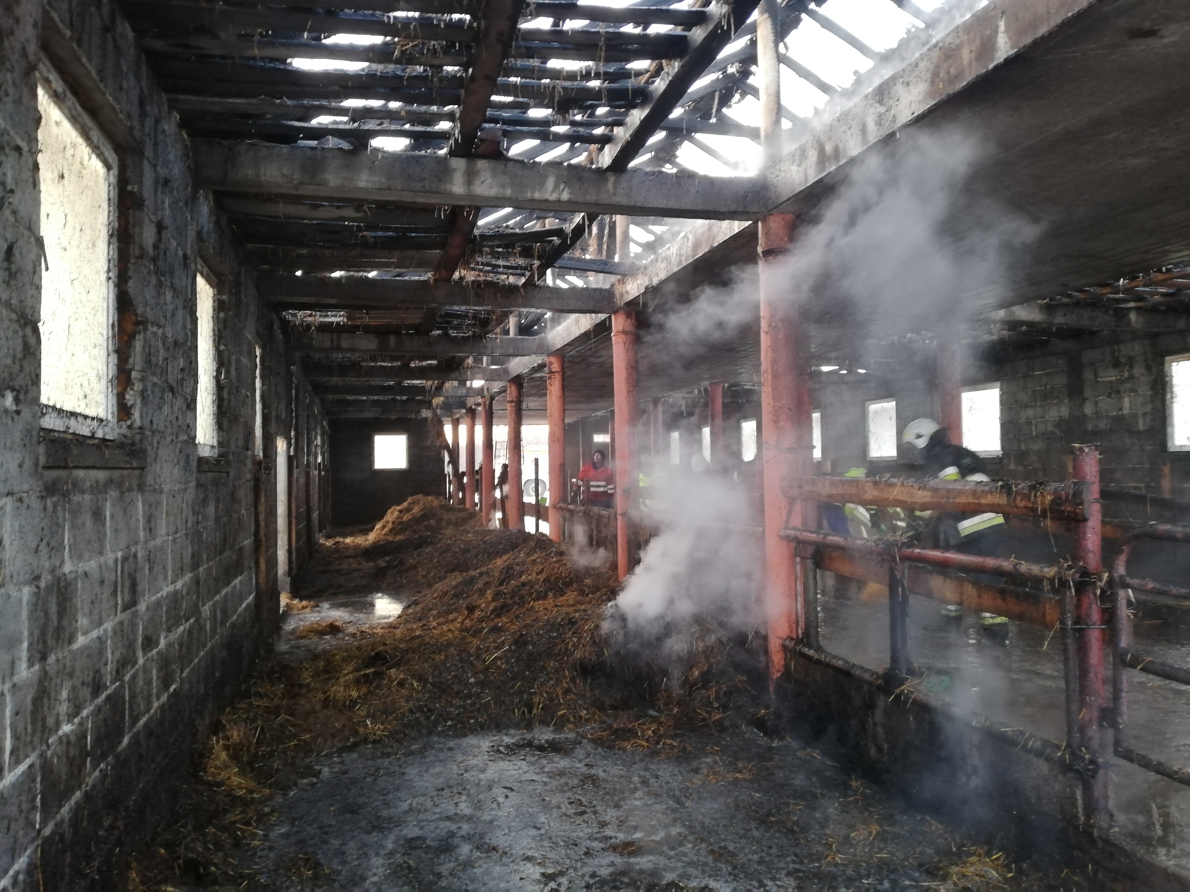 W chwili przybycia straży pożarnej na miejsce zdarzenia pożarem objęta była cała powierzchnia dachowa obory a w budynku znajdowało około 70 sztuk bydła. Działania strażaków polegały na zabezpieczeniu miejsca zdarzenia i w pierwszej kolejności wspólnie z gospodarzami ewakuacji zagrożonego bydła na zewnątrz. Następnie podano cztery prądy gaśnicze wody w celu ugaszenia pożaru. Spaleniu uległa cała więźba dachowa budynku.