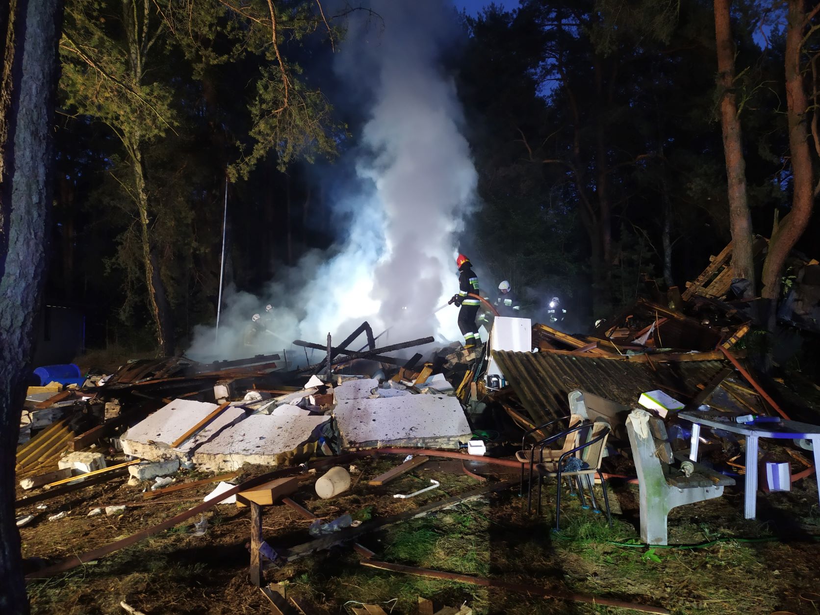 Na miejscu zdarzenia Kierujący Działaniem Ratowniczym potwierdził, że prawdopodobnie w wyniku wybuchu, całkowitemu zniszczeniu uległ domek letniskowy, dodatkowo teren gruzowiska objęty był pożarem. Działania straży polegały na zabezpieczeniu miejsca zdarzenia i udzieleniu kwalifikowanej pierwszej pomocy poszkodowanemu mężczyźnie do czasu przekazania ZRM. Poszkodowany śmigłowcem LPR został przetransportowany do szpitala. Po ugaszeniu ognia, przeszukano gruzowisko, w celu wykluczenia obecności innych osób poszkodowanych.