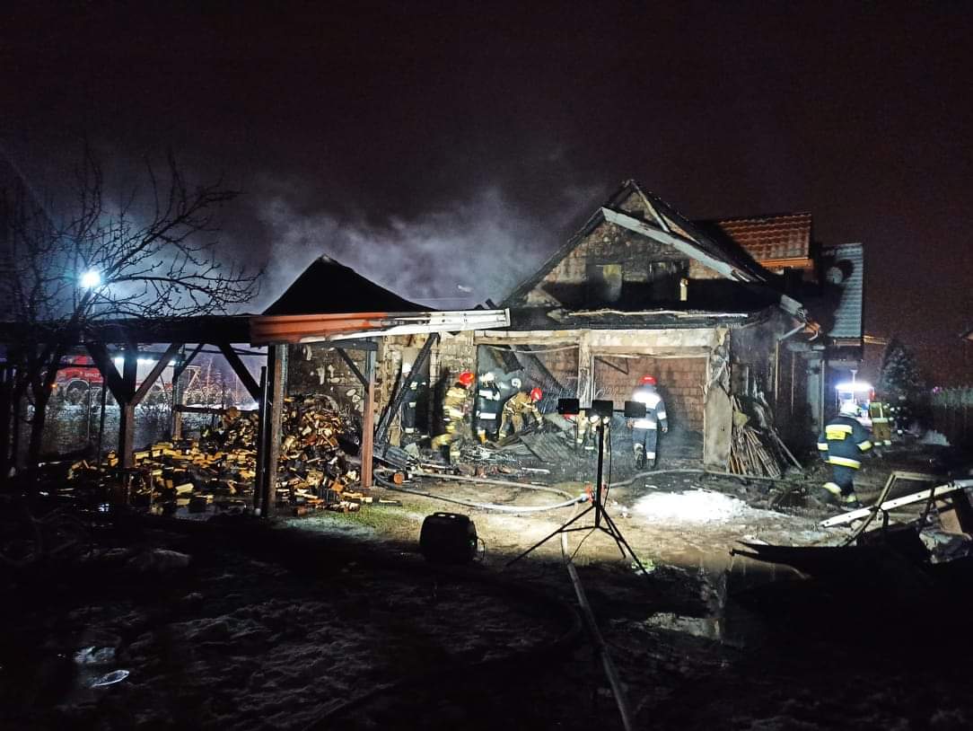 Po przyjeździe Straży Pożarnej na miejsce zdarzenia stwierdzono, że w całości pożarem objęty jest murowany garaż z dwoma pojazdami zaparkowanymi w środku. Ogień rozprzestrzeniał się na konstrukcję dachu budynku mieszkalnego jednorodzinnego w zabudowie szeregowej. Działania strażaków polegały na zabezpieczeniu miejsca zdarzenia, następnie podano dwa prądy wody na źródło pożaru. Ograniczono również rozprzestrzenianie się ognia w głąb konstrukcji dachu domu za pomocą dodatkowego prądu gaśniczego. Po ugaszeniu pożaru przy użyciu wentylatora osiowego oddymiono cały obiekt. Podczas akcji z garażu i poddasza budynku wyniesiono i zabezpieczono butle na gaz propan-butan. Niezbędne okazało się wykonanie prac rozbiórkowych celem dogaszenia ukrytych zarzewi ognia. Obiekt sprawdzono przy użyciu kamery termowizyjnej – nie stwierdzono miejsc o podwyższonej temperaturze, na czym działania zakończono.