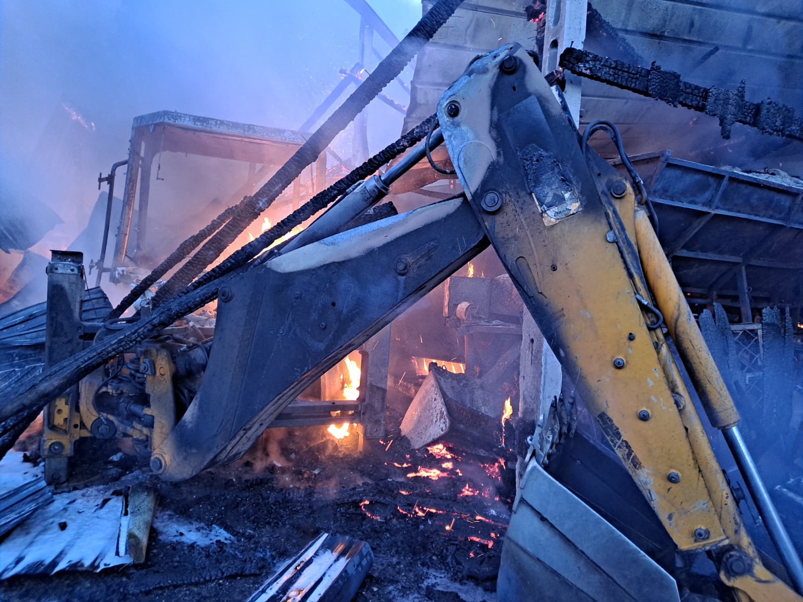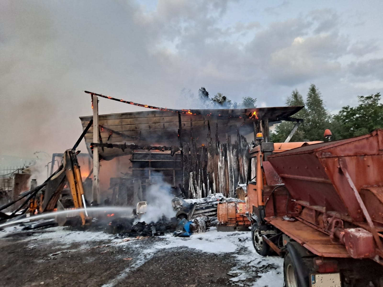 W trakcie przybycia pierwszych zastępów pożarem objęta były maszyny drogowe, samochody ciężarowe, inny sprzęt budowlany oraz wiata.