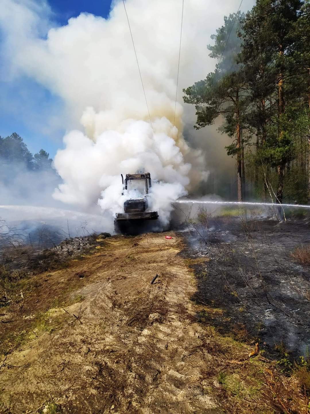 W chwili dojazdu straży pożarnej na miejsce zdarzenia, pożarem objęta była cała maszyna oraz poszycie lasu. Działania JOP polegały zabezpieczeniu miejsca zdarzenia, podaniu dwóch prądów gaśniczych w natarciu w celu ugaszenia palącej się maszyny oraz poszycia lasu. Po ugaszeniu strażacy przystąpili do przelania pogorzeliska oraz sprawdzeniu czy nie ma ukrytych zarzewi ognia. Po dokładnych sprawdzeniu działania zakończono.