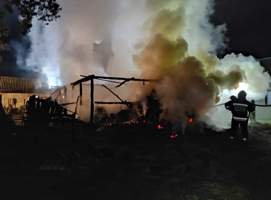 Po przyjeździe na miejsce zdarzenia pierwszego zastępu straży pożarnej, stwierdzono rozwinięty pożar drewnianego budynku stodoły, w której przechowywano siano, słomę oraz maszyny rolnicze. Działania straży polegały na zabezpieczeniu miejsca zdarzenia, następnie podaniu prądów wody w celu ugaszenia pożaru i w obronie zagrożonych sąsiadujących budynków. Ze spalonego budynku wyniesiono płody rolne, które przelewano wodą w celu ugaszenia ukrytych zarzewi ognia.
