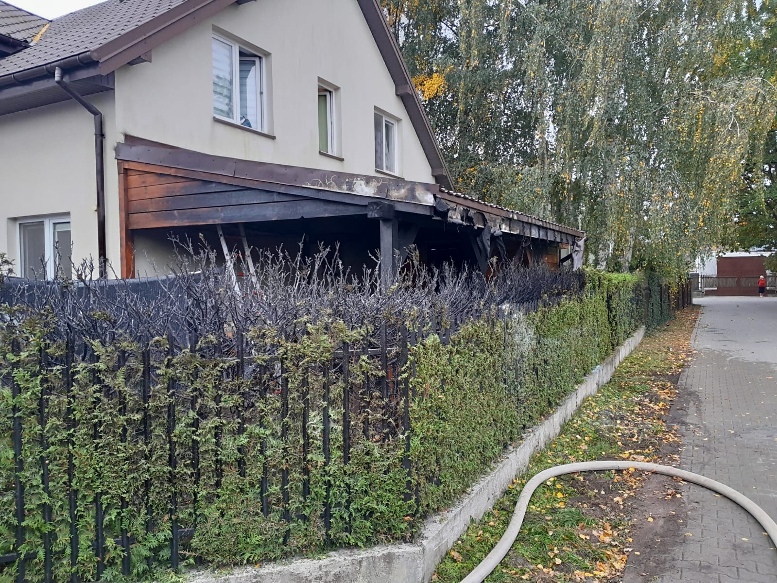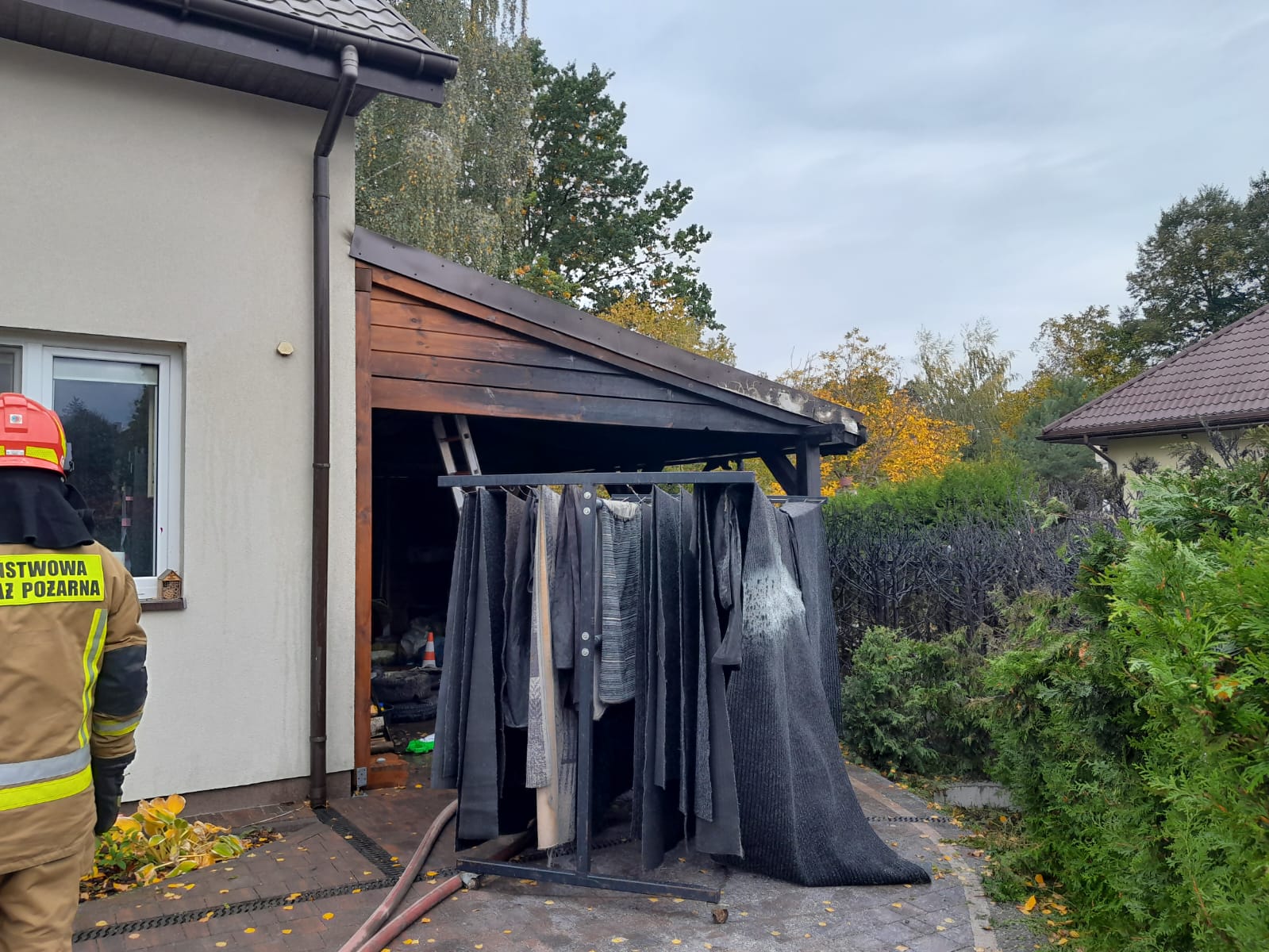 Po przybyciu pierwszego zastępu na miejsce stwierdzono, że pali się dobudowana do budynku jednorodzinnego drewniana wiata oraz żywopłot. Działania straży pożarnej polegały na zabezpieczeniu miejsca zdarzenia i podaniu jednego prądu gaśniczego. Po lokalizacji źródeł ognia miejsce akcji sprawdzono kamerą termowizyjną, budynek przewietrzono a pomieszczenia skontrolowano sprzętem wykrywczo-pomiarowym.