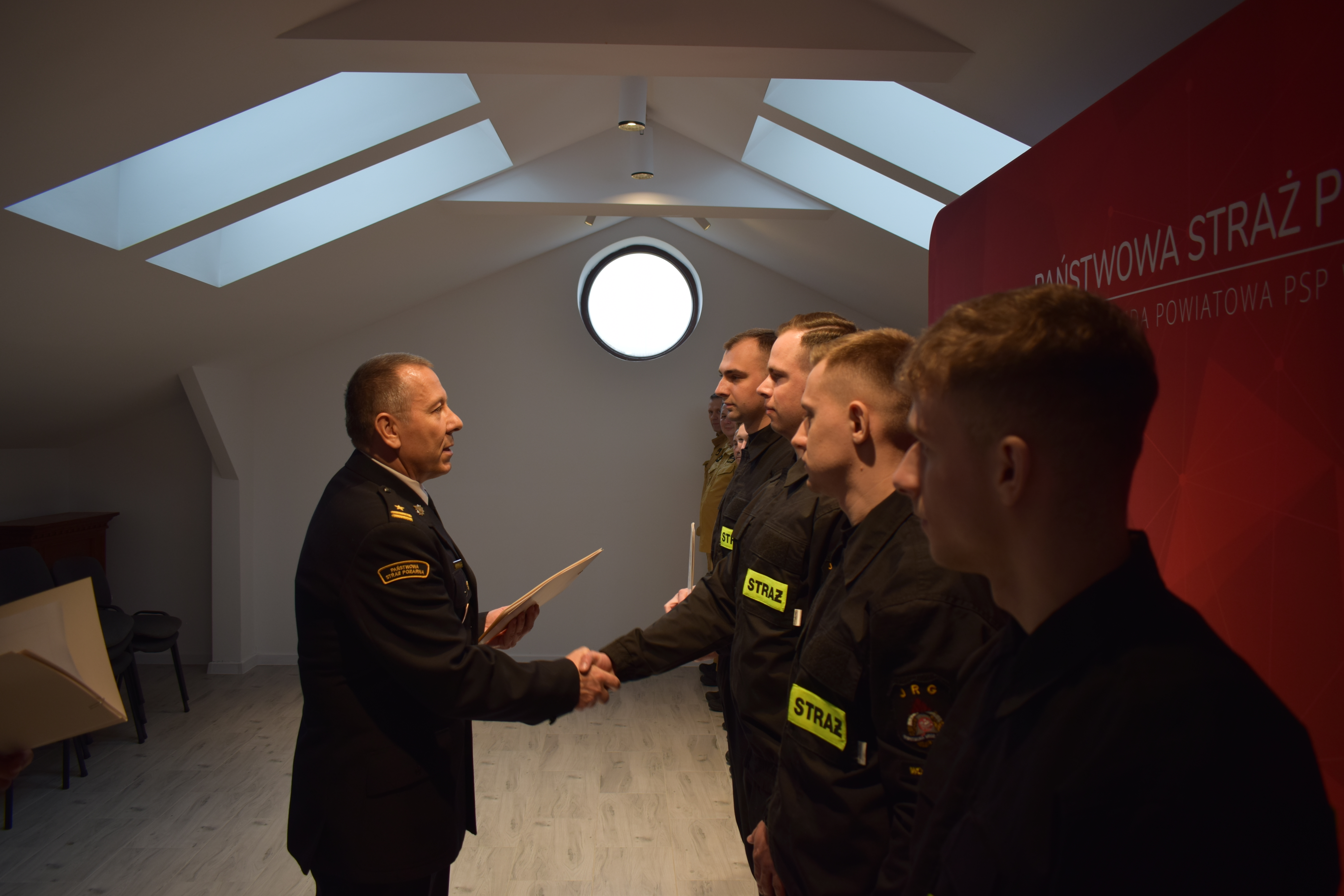 Rotę ślubowania w obecności Komendanta Powiatowego PSP w Wołominie oraz pocztu sztandarowego KP PSP w Wołominie złożyli: str. Dawid Zulczyk, str. Jakub Rękawek, str. Rafał Augustyniak oraz str. Jakub Perguł. Po złożeniu roty ślubowania na sztandar KP PSP w Wołominie odebrali akty mianowania na stanowisko stażysta. Docelowo funcjonariusze będą pełnić służbę w JRG Wołomin.