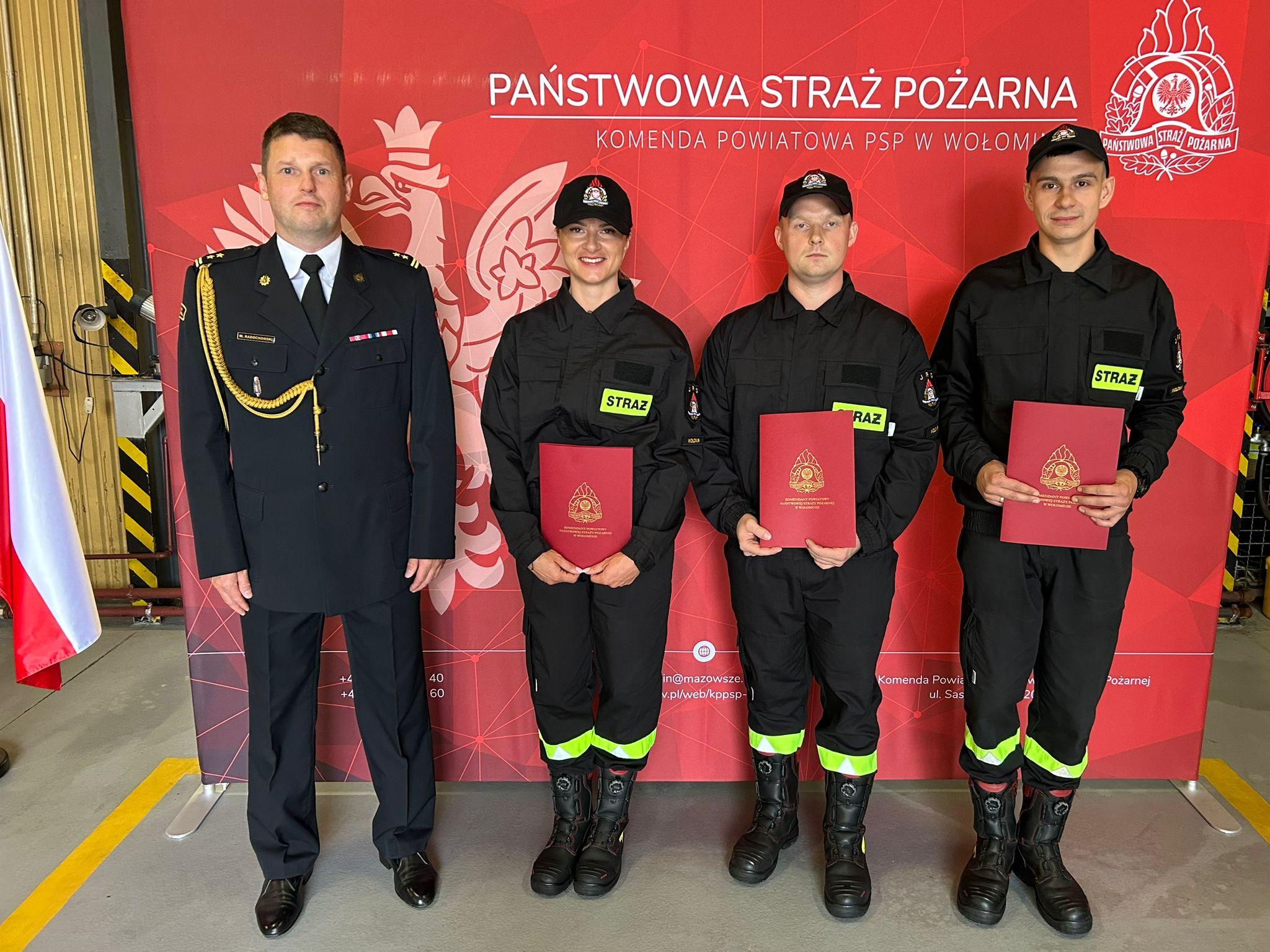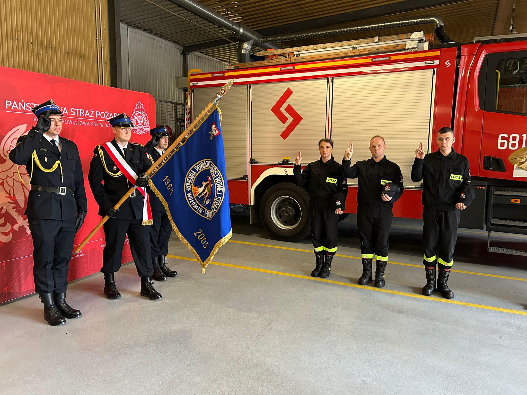 złożyli ślubowanie na sztandar KP PSP w Wołominie. Po tym otrzymali z rąk Z-cy Komendanta akty mianowania. Uroczystość zakończył meldunek oraz wspólne zdjęcie.