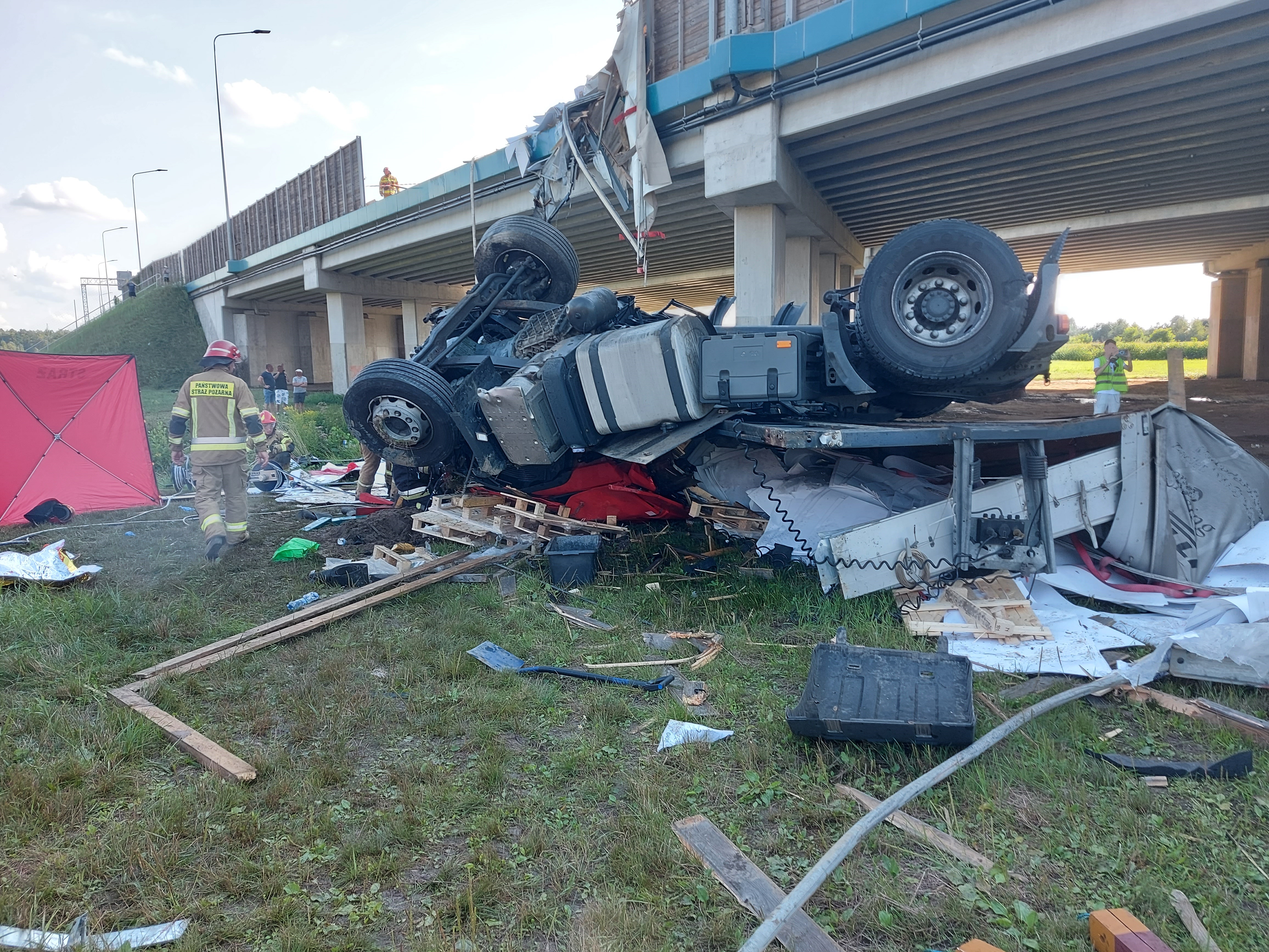 Na miejscu strażacy zastali zablokowane dwa pasy ruchu w kierunku Białegostoku oraz zniszczone trzy samochody osobowe. Samochód ciężarowy przebił bariery energochłonne i spadł z wiaduktu. Działania straży polegały na zabezpieczeniu miejsca zdarzenia, następnie przystąpiono do wykonania dostępu do zakleszczonego kierowcy ciężarówki. Niestety w wyniku odniesionych obrażeń lekarz stwierdził zgon poszkodowanego. Dodatkowo strażacy zabezpieczali lądowisko LPR i zneutralizowali wyciek paliwa z ciężarówki na rzece za pomocą zapór sorpcyjnych.