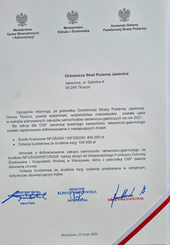 Z powiatu wołomińskiego promesy otrzymały jednostki OSP Jasienica Gm. Tłuszcz na zakup średniego samochodu ratowniczo – gaśniczego oraz OSP Kuligów Gm. Dąbrówka na zakup lekkiego samochodu ratowniczo – gaśniczego. Obie jednostki są włączone w struktury Krajowego systemu ratowniczo – gaśniczego.