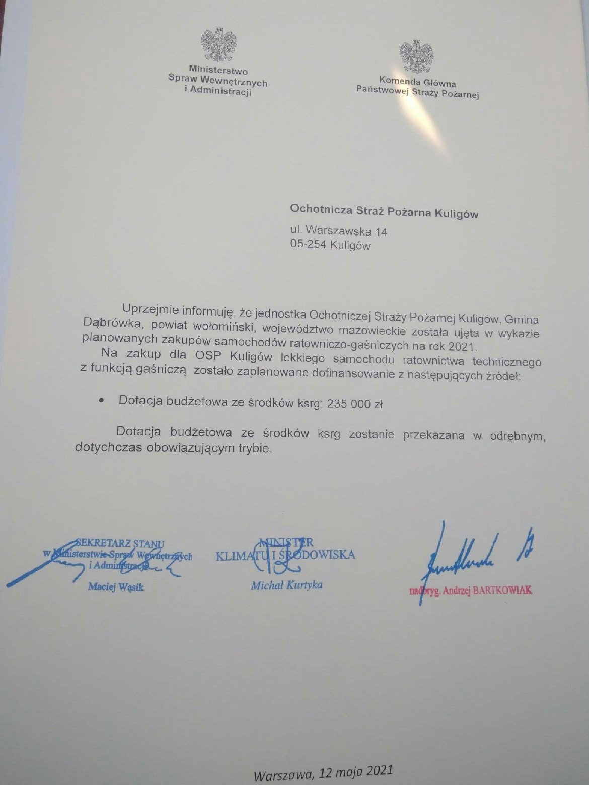 12 maja 2021 roku w Komendzie Wojewódzkiej PSP w Warszawie miała miejsce uroczysta zbiórka, podczas której wręczono promesy na zakup nowych samochodów ratowniczo-gaśniczych oraz akty włączenia do krajowego systemu ratowniczo-gaśniczego dla jednostek ochotniczych straży pożarnych z terenu województwa mazowieckiego.