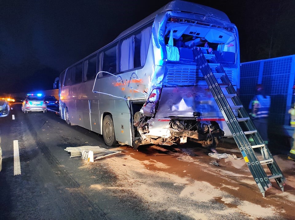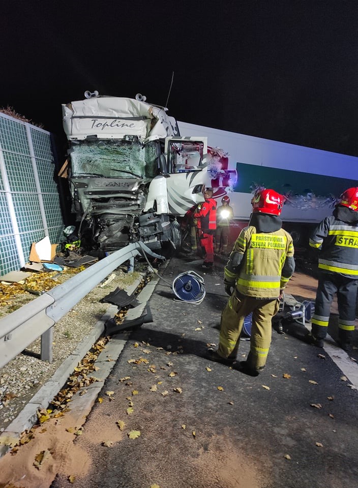 Na miejscu strażacy zastali zablokowane dwa pasy ruchu w kierunku Warszawy oraz zniszczoną ciężarówkę, a także uszkodzony autokar. Samochód ciężarowy uderzył w tył autobusu, w którym znajdowało się trzydzieści osób, następnie zatrzymał się na barierach energochłonnych w poprzek drogi, blokując dwa pasy. Działania straży polegały na zabezpieczeniu miejsca zdarzenia, następnie przystąpiono do wykonania dostępu sprzętem hydraulicznym do zakleszczonego kierowcy ciężarówki oraz uwalniania osób z autokaru. Dodatkowo strażacy zabezpieczali lądowisko LPR i zneutralizowali wyciek paliwa z ciężarówki oraz autokaru.