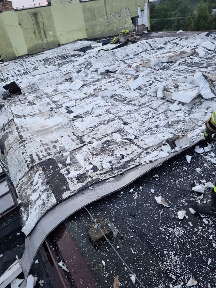 Po przybyciu na miejsce zdarzenia straży pożarnej stwierdzono, że z części budynku szkoły podstawowej zerwane zostało przekrycie stropodachu wykonane z papy ułożonej na płytach styropianowych. Dziania JOP polegały na zabezpieczeniu miejsca zdarzenia, usunięciu uszkodzonych elementów konstrukcji dachu i doraźnym zabezpieczeniu połaci dachu dostarczonymi plandekami.