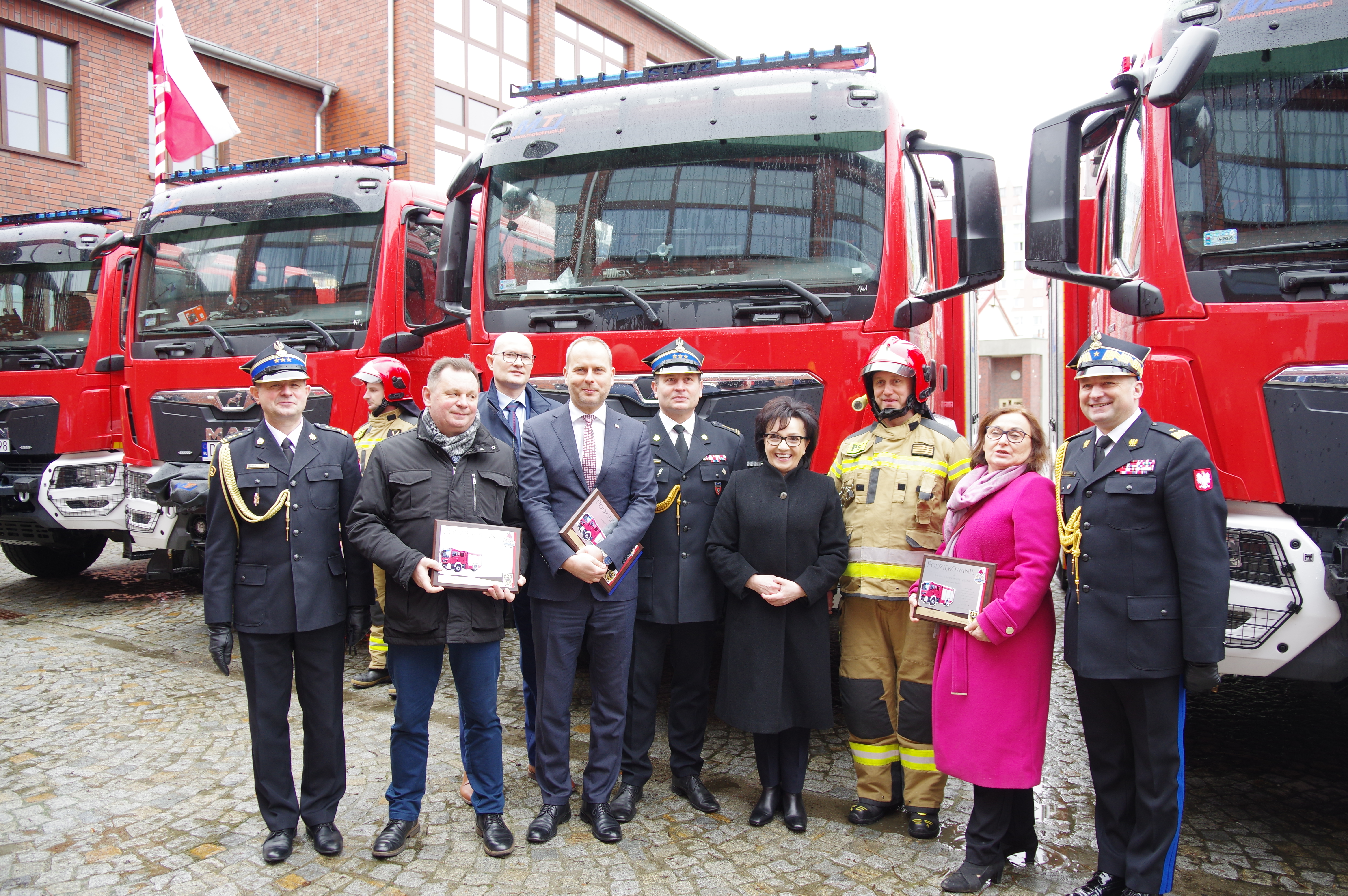 Uroczyste przekazanie 20 nowych samochodów ratowniczo – gaśniczych do dolnośląskich komend powiatowych i miejskich PSP, w tym do KP PSP Wołów odbyło się 17 stycznia br. w Komendzie Wojewódzkiej PSP we Wrocławiu, w którym udział wzięła Pani marszałek Sejmu RP Elżbieta Witek oraz licznie przybyli przedstawiciele parlamentu RP, DUW i UM, KG PSP, a także dolnośląskich urzędów i instytucji współfinansujących zakup samochodów oraz samorządowcy.