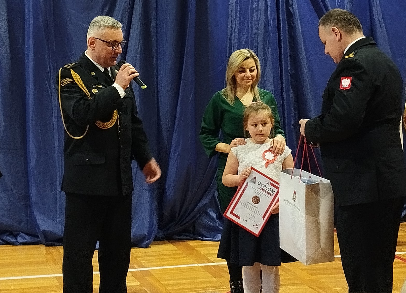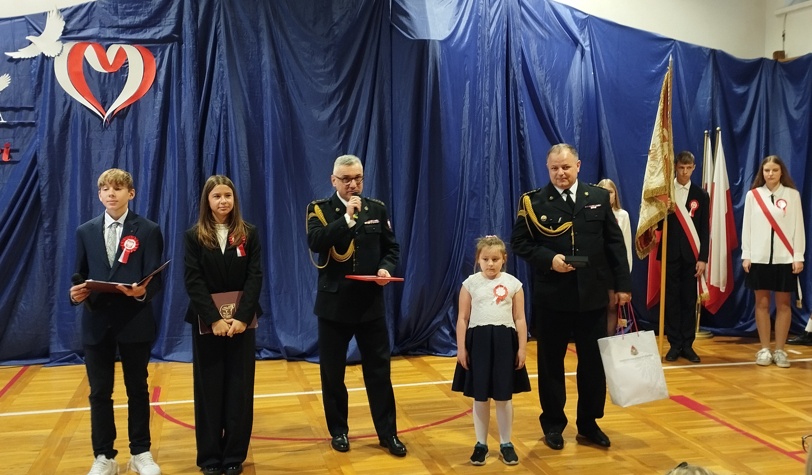 Odznaka „Iuvenis Fotri” została wręczona przez Zastępcę Dolnośląskiego Komendanta PSP st. bryg. Piotra Grzyba oraz Komendanta Powiatowego PSP w Wołowie st. bryg. Jarosława Nadwodnego. Podczas swojego wystąpienia Zastępca Dolnośląskiego Komendanta PSP st. bryg. Piotr Grzyb nawiązując do 106 rocznicy odzyskania przez Polskę niepodległości stwierdził, że „dzięki bohaterom walczącym o wolną Polskę żyjemy w wolnym kraju, a w związku z tym dziś bohater nie nosi zbroi oraz broni. Obecnie bohaterem może zostać każdy, bez względu na wiek. Przykładem bohaterskiej postawy jest wasza koleżanka Weronika, która uratowała życie najbliższej osobie, czyli mamie. Wy też możecie uratować życie nie tylko najbliższym, lecz również innym nieznajomy osobom, będącym w potrzebie poprzez wybranie numeru alarmowego 112. Proszę was o to, abyście nigdy nie przechodzili obojętnie obok osób w potrzebie.” Na zakończenie swojego przemówienia st. bryg. Piotr Grzyb podziękował mamie Weroniki oraz dyrekcji szkoły i nauczycielom za trud włożony w edukację, dotyczącą prawidłowych zachowań w sytuacji zagrożenia zdrowia i życia ludzkiego. Słowa uznania popłynęły również w stronę funkcjonariuszy Komendy Powiatowej PSP w Wołowie za właściwą edukację dzieci i młodzieży w zakresie zagrożeń i prawidłowego reagowania w ramach prowadzonych kampanii społecznych.