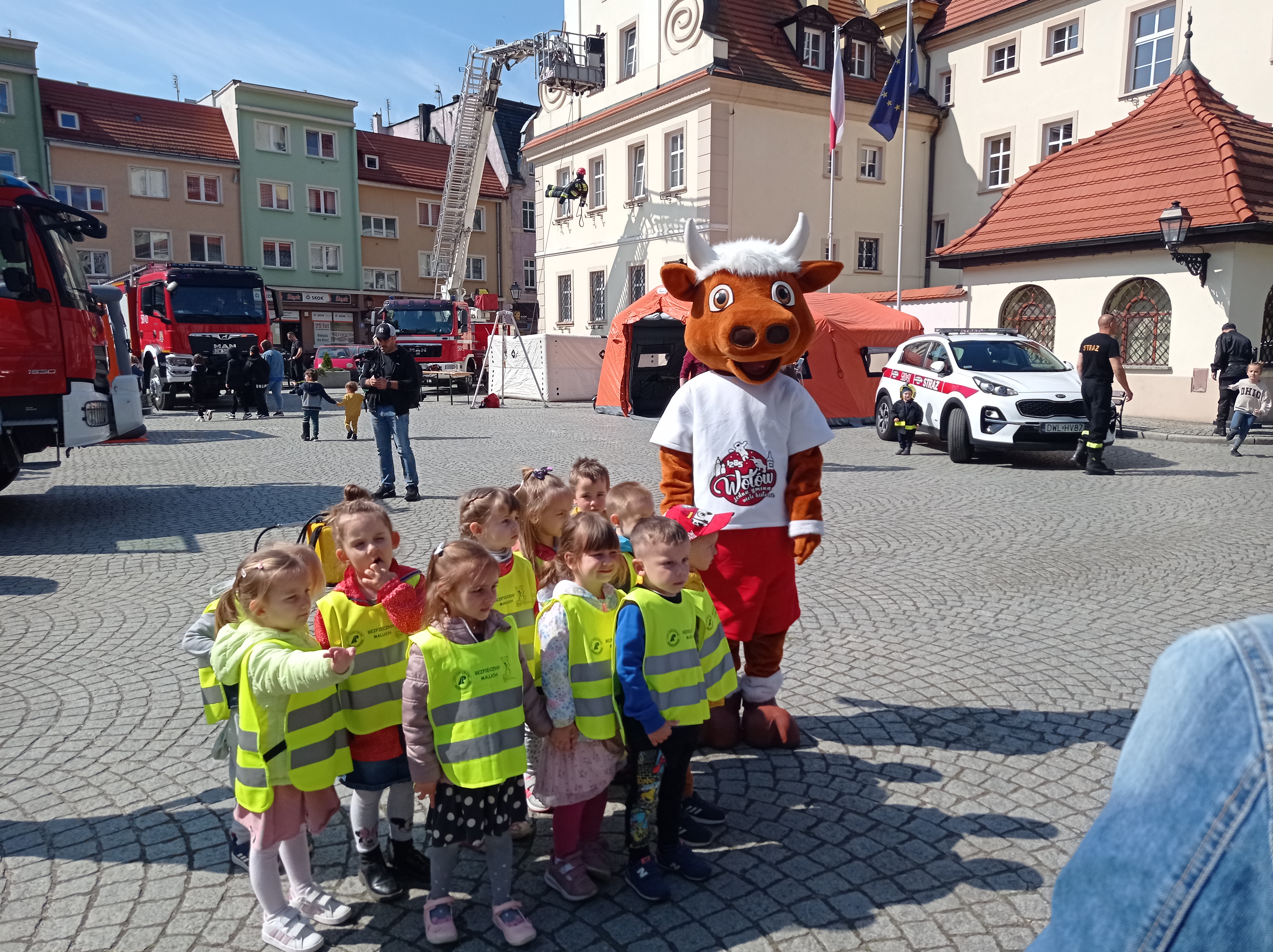 Dzieci, które przybyły na pokazy witał „WOŁEK”, maskotka gminy Wołów z koszem pełnym słodyczy, a zgłodniali mieszkańcy gminy mogli posilić się strażacką grochówką.