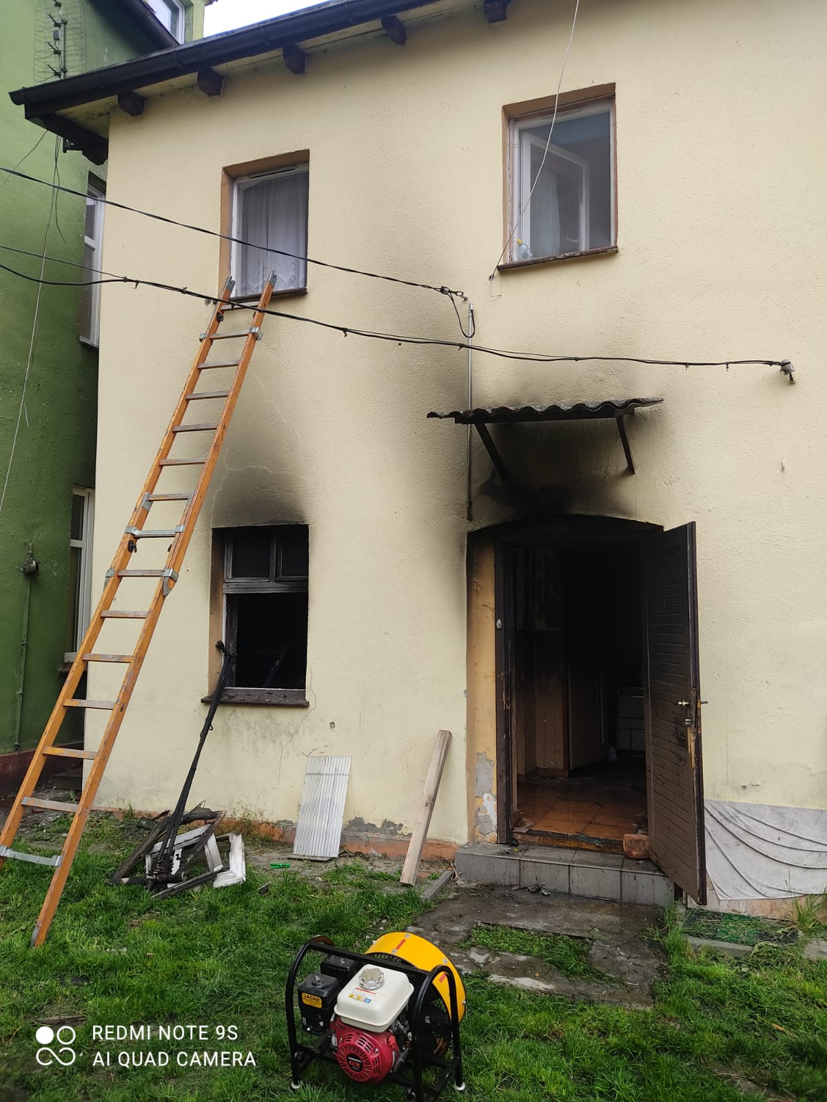 Równocześnie trwały działania gaśnicze. Podano prądy wody w natarciu, co miało na celu szybkie ugaszenie pożaru, a także prąd wody w obronie na sąsiedni przyległy budynek mieszkalny, aby nie dopuścić do rozprzestrzenienia się pożaru na jego część. W celu szybkiego usunięcia toksycznych produktów spalania z budynku zastosowano wentylator oddymiający.