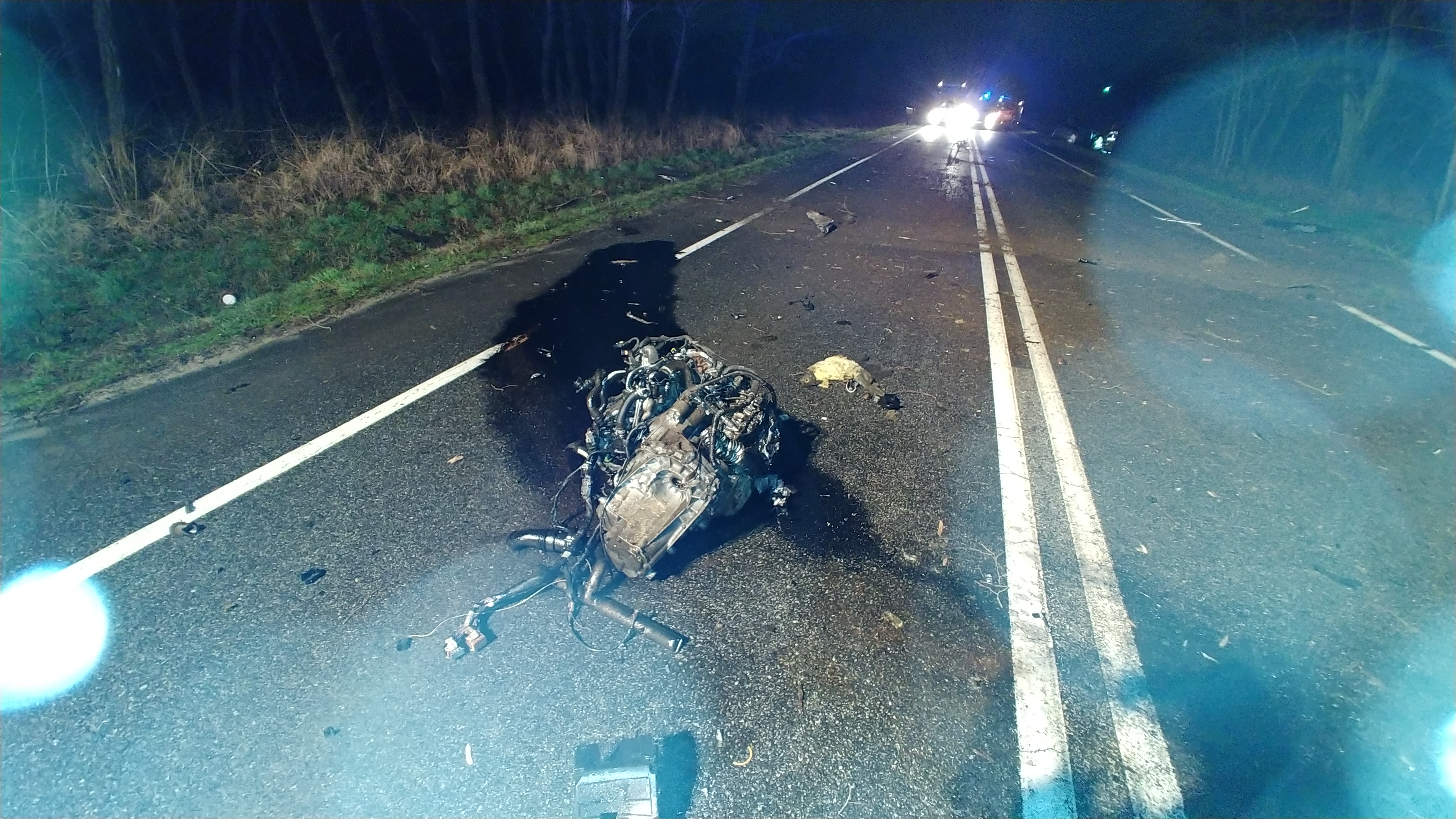 Siła uderzenia była tak duża, że z pojazdu wypadł silnik na jezdnię, a sam pojazd znalazł się w przydrożnym rowie.