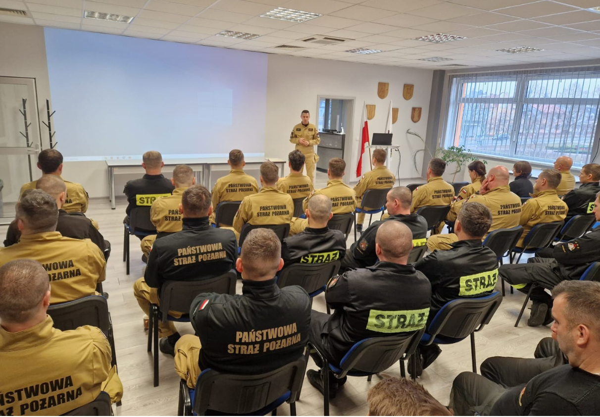 Pierwszym tematem odprawy było bezpieczeństwo strażaka-ratownika, ze szczególnym uwzględnieniem środków ochrony indywidualnej. Omówiono kluczowe zagrożenia, jakie mogą pojawić się zarówno podczas jazdy do zdarzenia, jak i w trakcie prowadzenia działań ratowniczo-gaśniczych. Dodatkowo przeprowadzono kontrolę stanu i kompletności umundurowania specjalnego strażaków.
