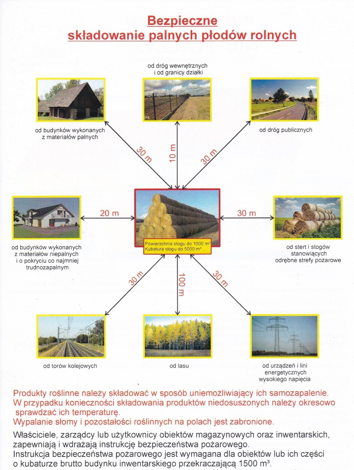 " Należy pamiętać, że wokół stogów i stert powierzchnia o szerokości co najmniej 2 m w odległości 3 m od ich obrysu powinna być pozbawiona materiałów palnych. Strefa pożarowa sterty i stogu nie może przekroczyć 1000 m2 / 5000 m3"