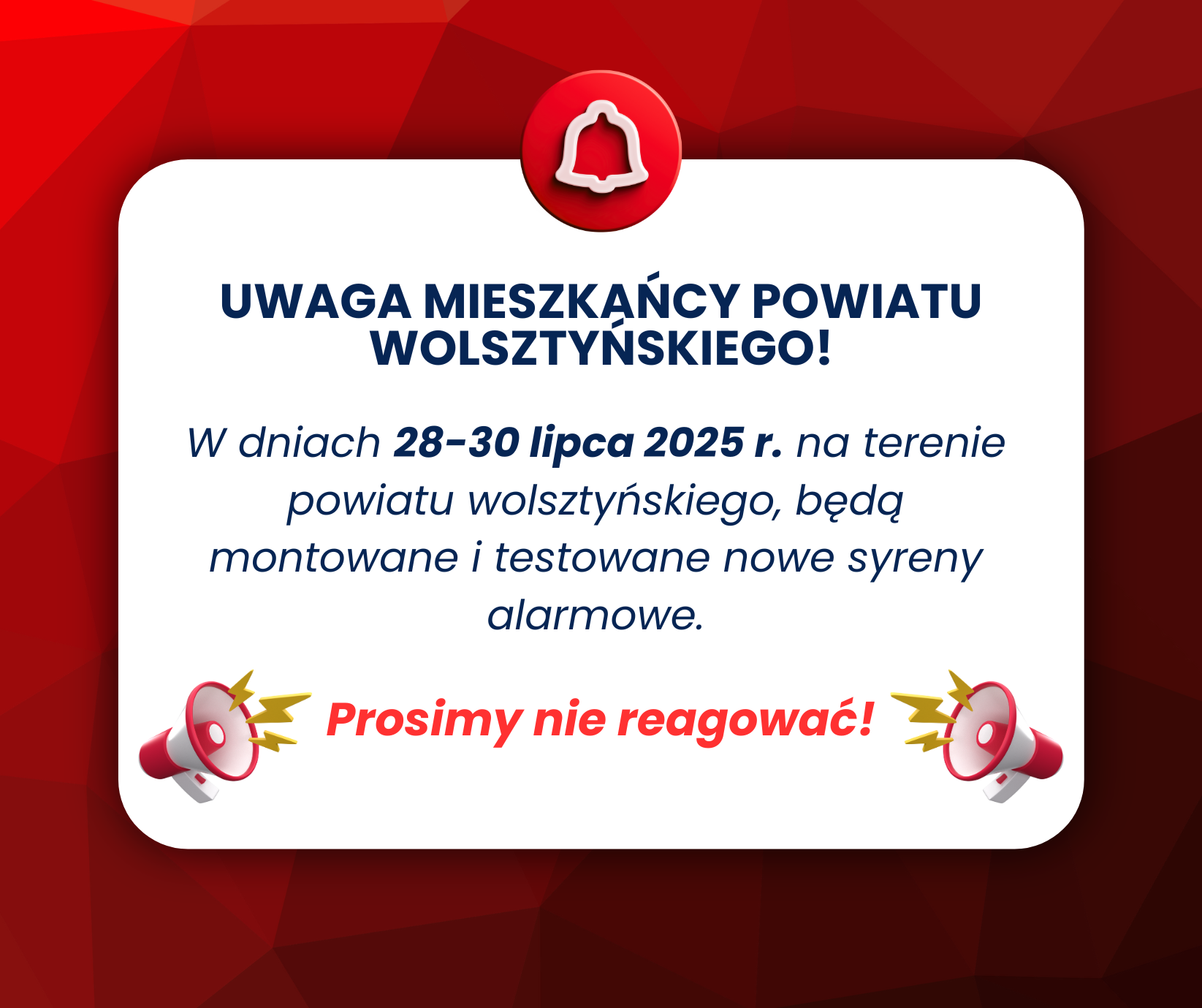 W tych dniach będą uruchamiane próbnie sygnały alarmowe - prosimy o zachowanie spokoju i NIE REAGOWANIE na dźwięk syren. Są to wyłącznie testy techniczne.