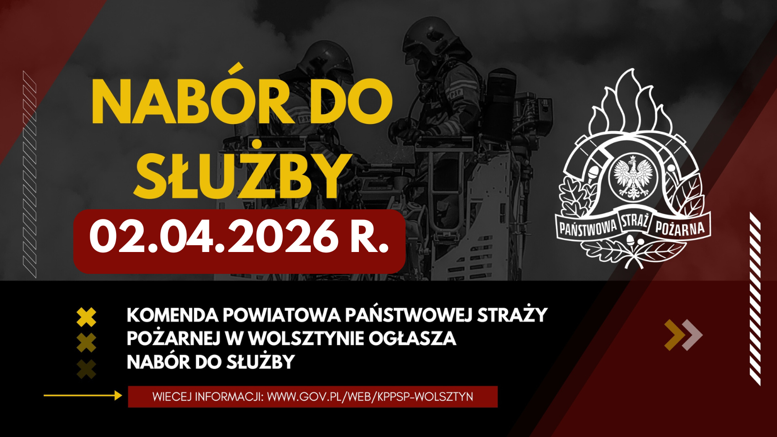 02 kwietnia 2026 roku został ogłoszony nabór do służby w KP PSP w Wolsztynie na docelowe stanowisko - starszy specjalista.