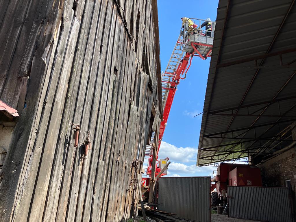 Na miejsce zdarzenia zadysponowano dwa zastępy z Jednostki Ratowniczo-Gaśniczej w Wolsztynie oraz jeden zastęp z OSP Tuchorza. Po przybyciu na miejsce zdarzenia strażacy zastali niebezpiecznie zwisające elementy dachu oraz drewniane części ściany szczytowej.