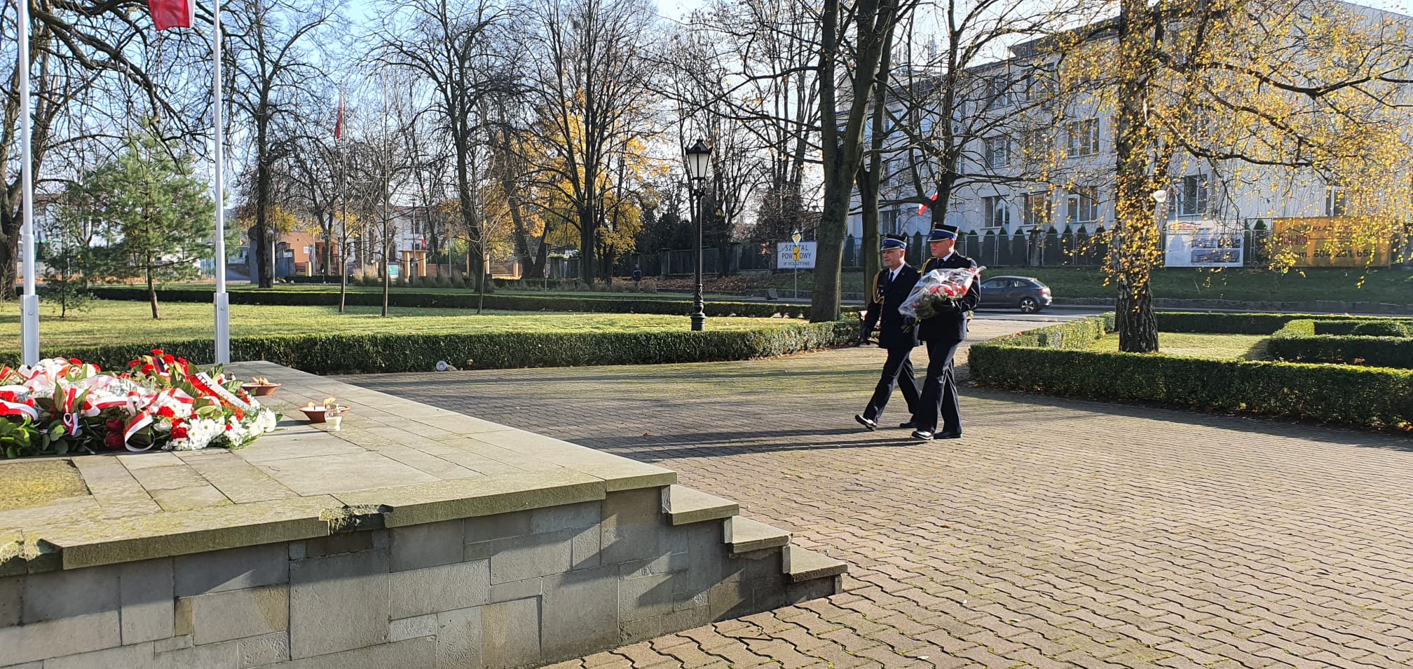 Następnie, mł. bryg. Roman Rembielak, wraz z mł. bryg. Szymonem Czachnowskim - Naczelnikiem Wydziału Operacyjno-Szkoleniowego złożyli kwiaty przed wolsztyńskim Pomnikiem Niepodległości.