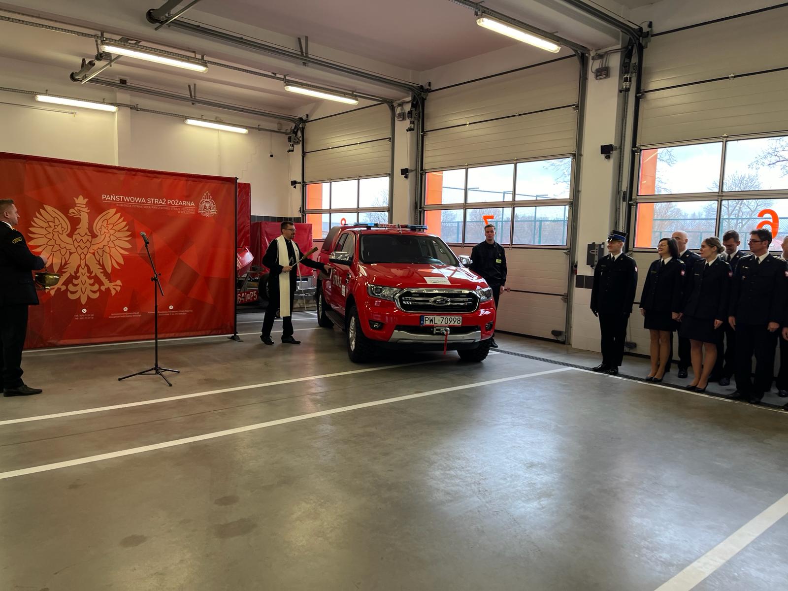 Druga część uroczystości odbyła się w garażu jednostki ratowniczo-gaśniczej. Symbolicznego przekazania kluczy do nowego lekkiego samochodu rozpoznawczo-ratowniczego dokonali przedstawiciele instytucji oraz władz samorządowych, a o. Grzegorz Rurański poświęcił pojazd.