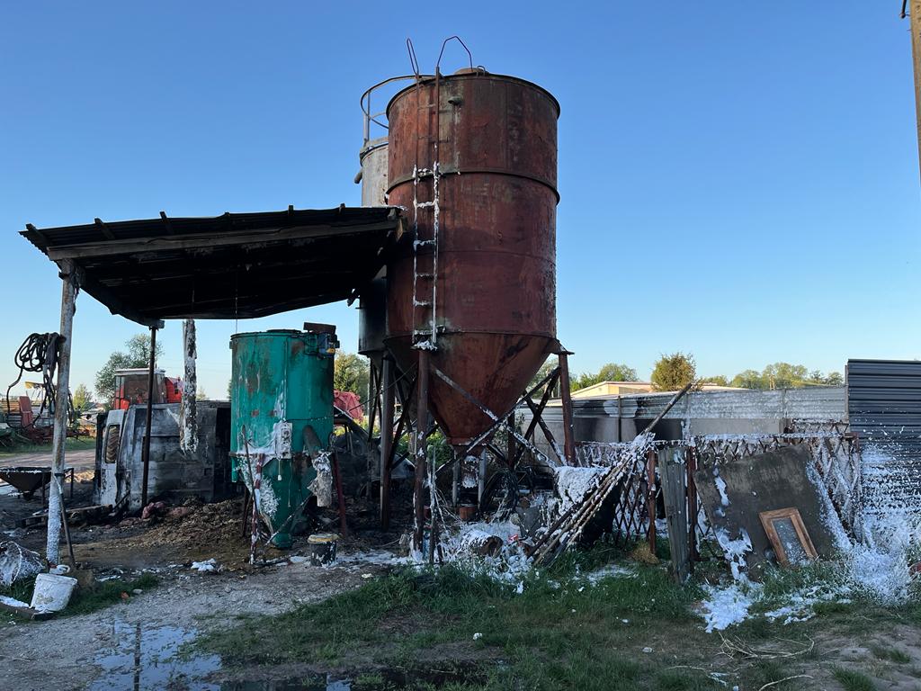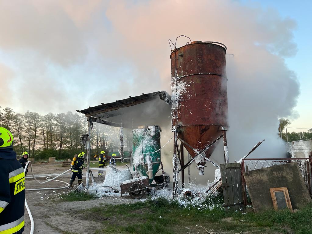 Działania strażaków polegały na zabezpieczeniu miejsca zdarzenia, podaniu prądu gaśniczego w natarciu na palącą się konstrukcję dachową i mieszalnik pasz. Dodatkowo podano jeden prąd piany średniej w natarciu na palący się samochód dostawczy. Działania w obronie polegały na schładzaniu silosów paszowych, które znajdowały się w bliskiej odległości od pożaru.