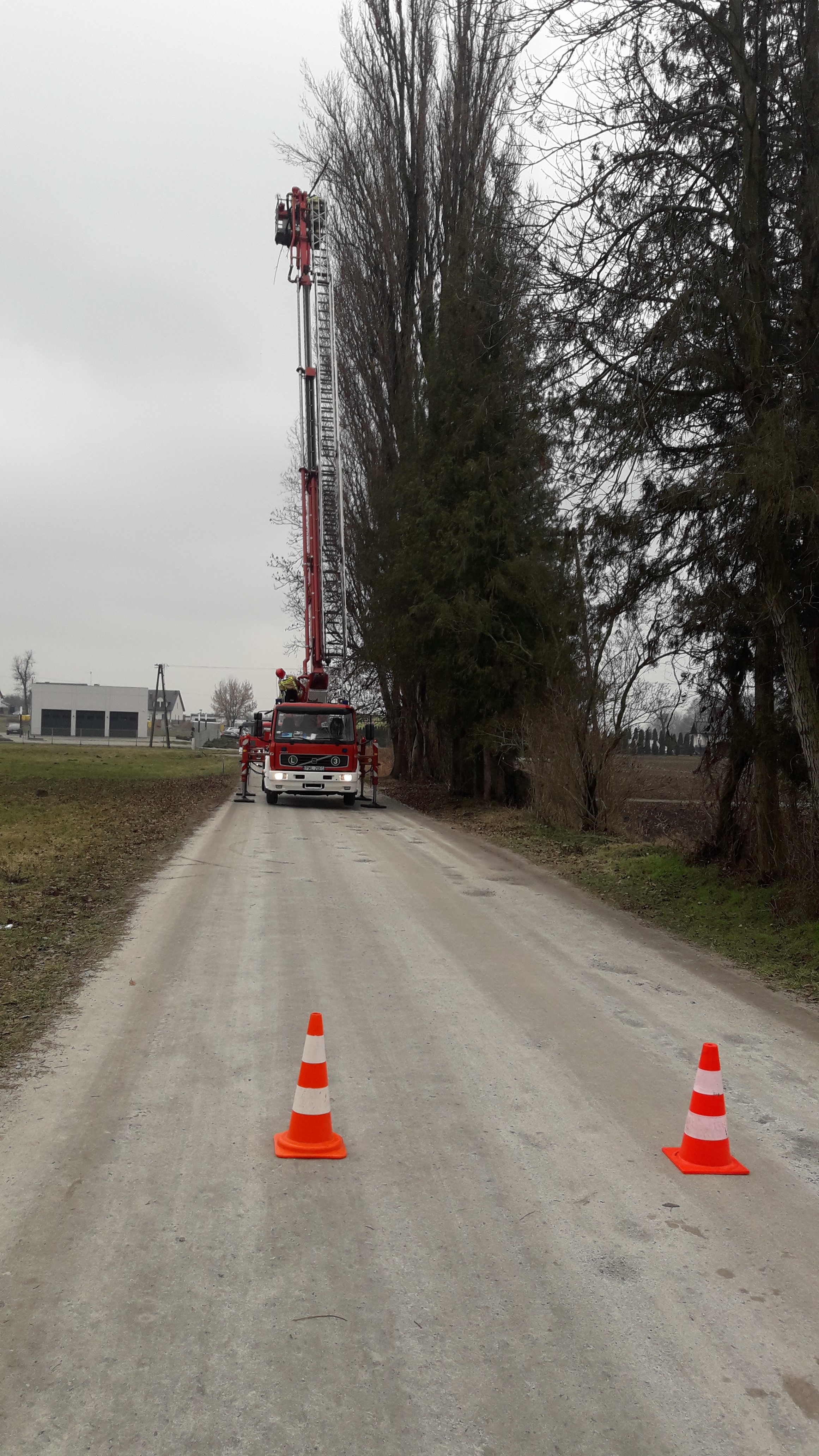 Dyżurny SKKP niezwłocznie dysponuje dwa zastępy z JRG Wolsztyn. Po przyjeździe zastępów na miejsce zdarzenia zastano dwa wysokie drzewa (topole) na których zwisały zagrażające upadkiem konary. Sprawiono podnośnik hydrauliczny oraz przy użyciu pilarki spalinowej do cięcia drzewa usunięto zagrożenie.