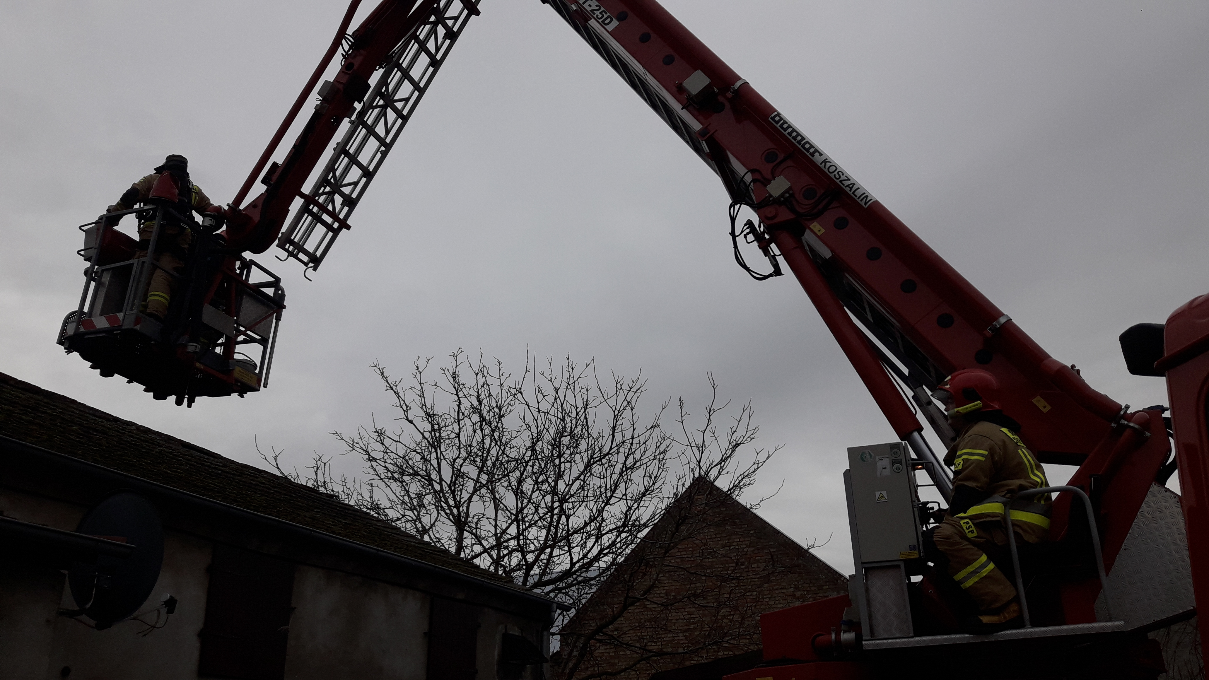 W pierwszej fazie działań strażacy wyposażeni w aparaty ochrony dróg oddechowych wyciągnęli żar z pieca na zewnątrz budynku gdzie następnie zlewano go obficie prądem wody. W tym samym czasie strażacy wyposażeni w sprzęt do ratownictwa wysokościowego oraz aparaty, wykorzystując podnośnik hydrauliczny dotarli do górnej części przewodu kominowego gdzie zrzucono środek gaśniczy w postaci proszku. Po ugaszeniu przewodu kominowego podjęto działania związane z wyczyszczeniem przewodu kominowego oraz ponownym zrzuceniu proszku celem całkowitego wyeliminowania zagrożenia. Kotłownia została przewietrzona, pomieszczenie sprawdzono detektorem wielogazowym - nie stwierdzono zagrożenia.