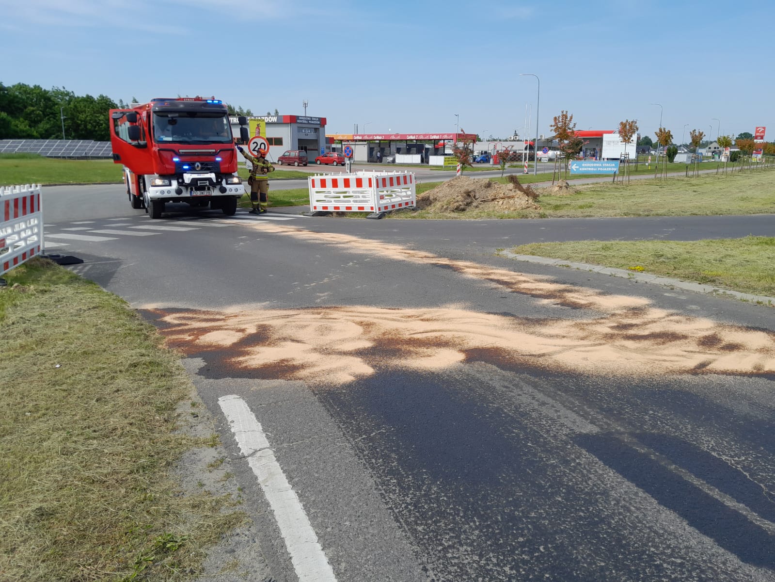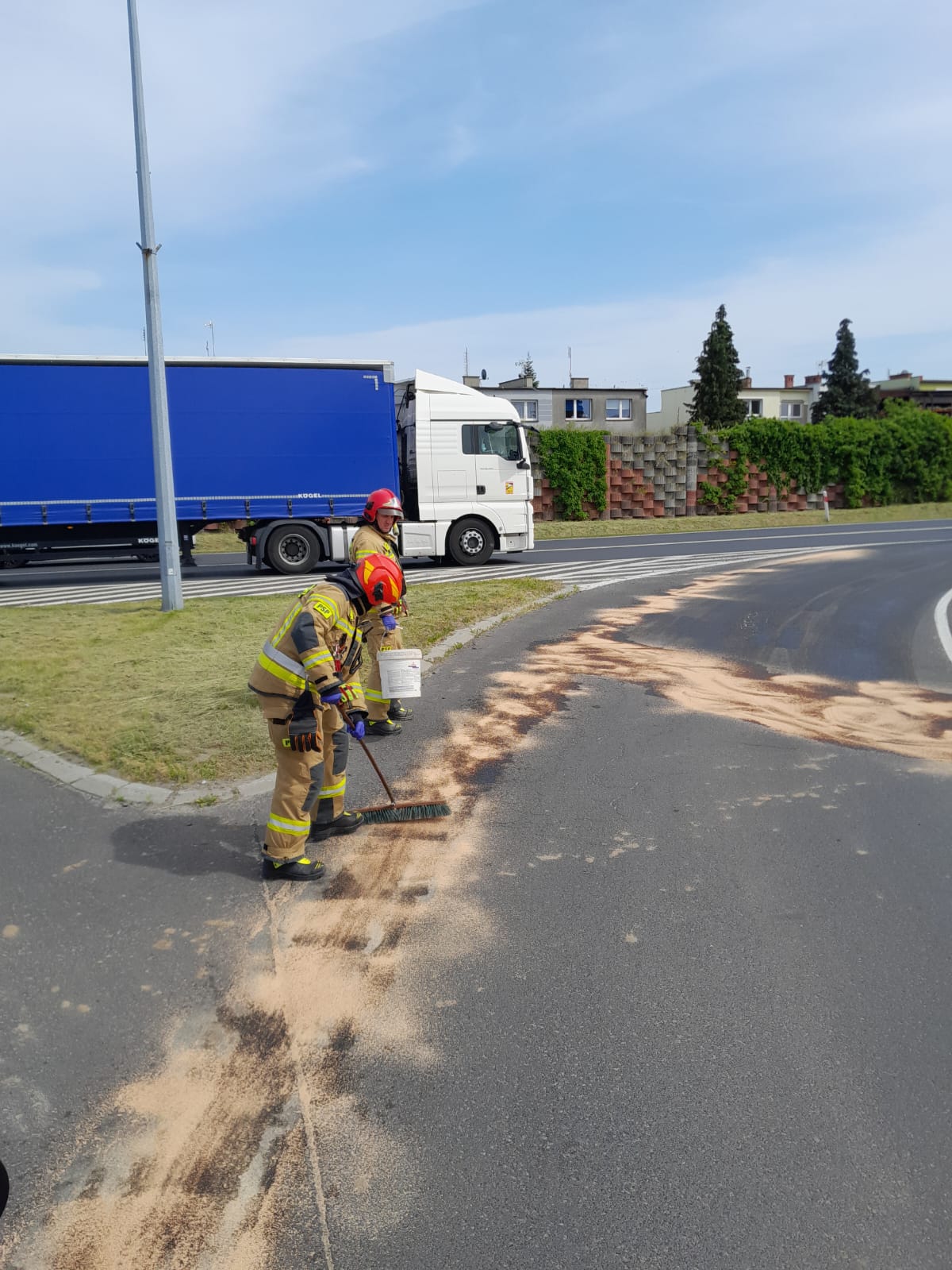Po przybyciu na miejsce zdarzenia strażacy zastali plamę oleju napędowego obejmującą kilka kilometrów pasa jezdni w kierunku Zielonej Góry, a w miejscowości Niałek Wielki znajdował się uszkodzony pojazd ciężarowy. Z uwagi na rozległość zagrożenia niezwłocznie zadysponowano kolejne jednostki (OSP Kębłowo, OSP Obra oraz OSP Tłoki).