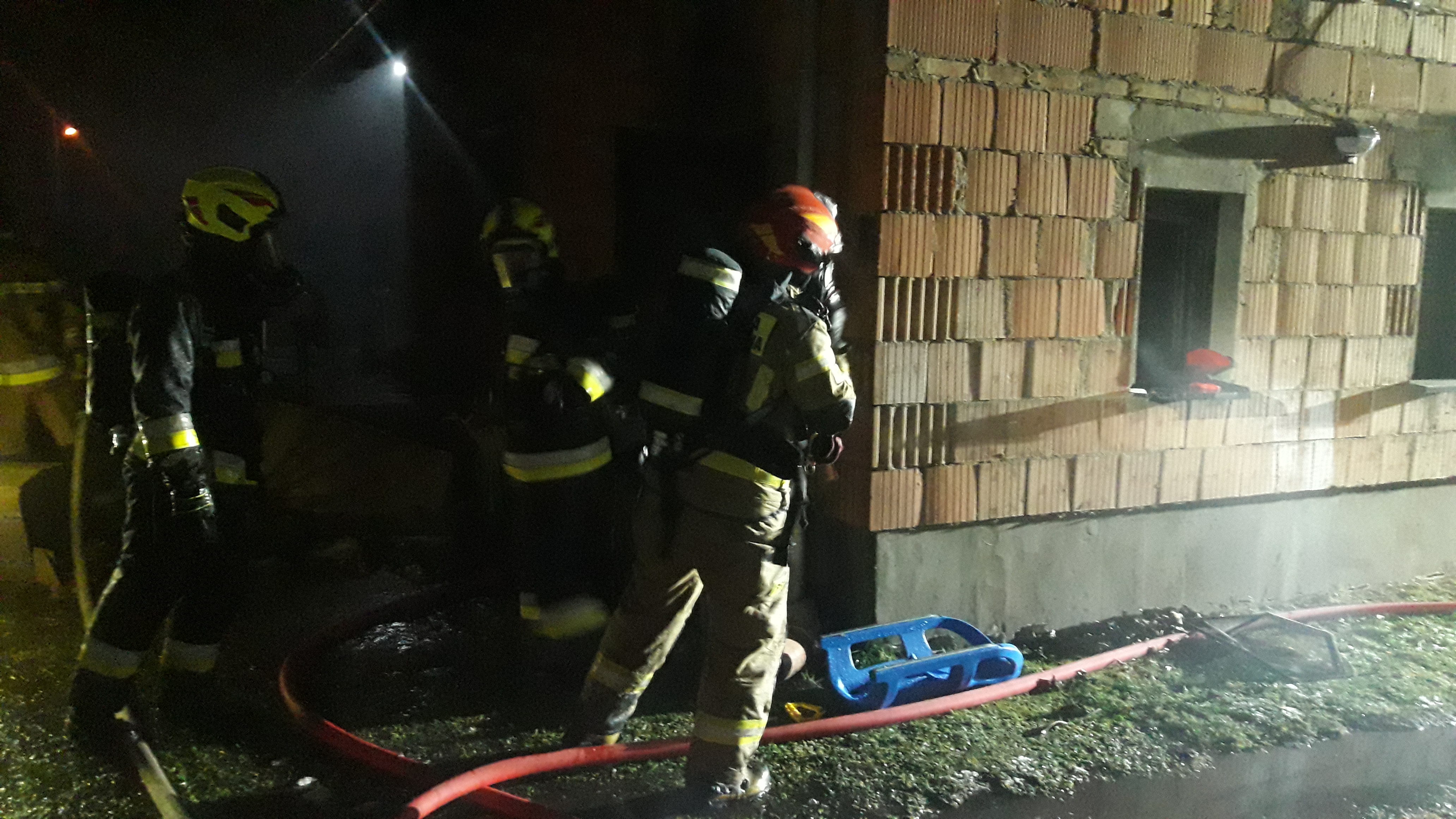 Działania polegały na zabezpieczeniu miejsca zdarzenia a następnie wejściu strażaków w aparatach ochrony układu oddechowego z kamerą termowizyjną oraz prądem gaśniczym do pomieszczenia kotłowni w celu zlokalizowania źródła pożaru. Kolejni strażacy w aparatach ochrony układu oddechowego z kamerą termowizyjną weszli do budynku głównym wejściem w celu jego przeszukania oraz wyeliminowania potencjalnych źródeł pożaru - brak zagrożenia. Główny wyłącznik prądu znajdujący się w przedsionku budynku wyłączył się automatycznie. Ustalono łączność radiową na miejscu prowadzonych działań na potrzeby kierującego działaniem ratowniczym. Dowódca akcji z uwagi na panujące warunki oraz zagrożenia wyznaczył w zabezpieczeniu kolejnych strażaków w aparatach ochrony układu oddechowego. Działania od strony podwórza przy kotłowni zostały oświetlone przy wykorzystaniu przenośnej lampy. Podczas gaszenia pożaru zauważono lejącą się wodę w kotłowni z instalacji wodnej budynku (przetopiony filtr wody przyłącza wodnego), wobec czego zamknięto główny zawór wody. Po ugaszeniu pożaru wszystkie spalone rzeczy oraz materiały wyciągnięto na zewnątrz budynku i zlano je obficie wodą. Cały budynek został przewietrzony wykorzystując turbowentylator. Sprawdzono wszystkie pomieszczenie w budynku detektorem wielogazowym pod kątem występowania tlenku węgla - wynik negatywny.