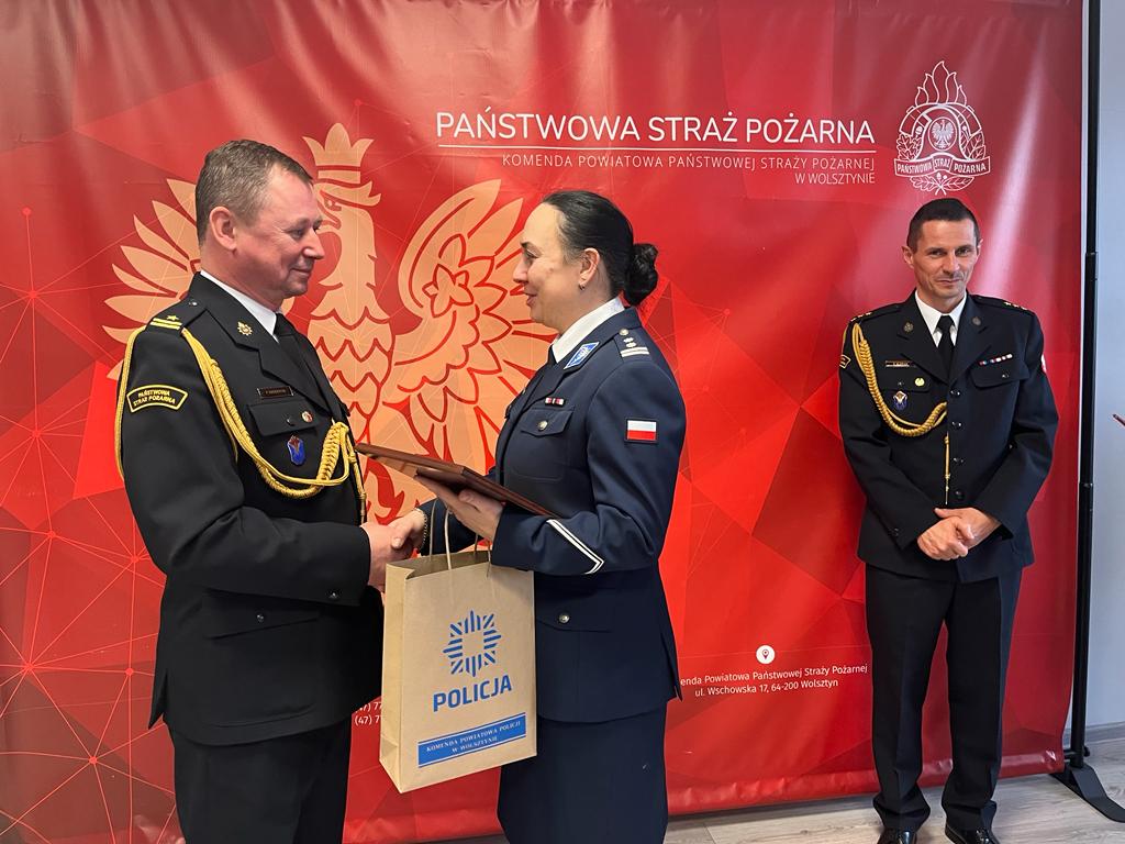 Funkcjonariusze Państwowej Straży Pożarnej, Druhowie ochotniczych straży pożarnych oraz przedstawiciele instytucji współpracujących z Komendą Powiatową Państwowej Straży Pożarnej w Wolsztynie.