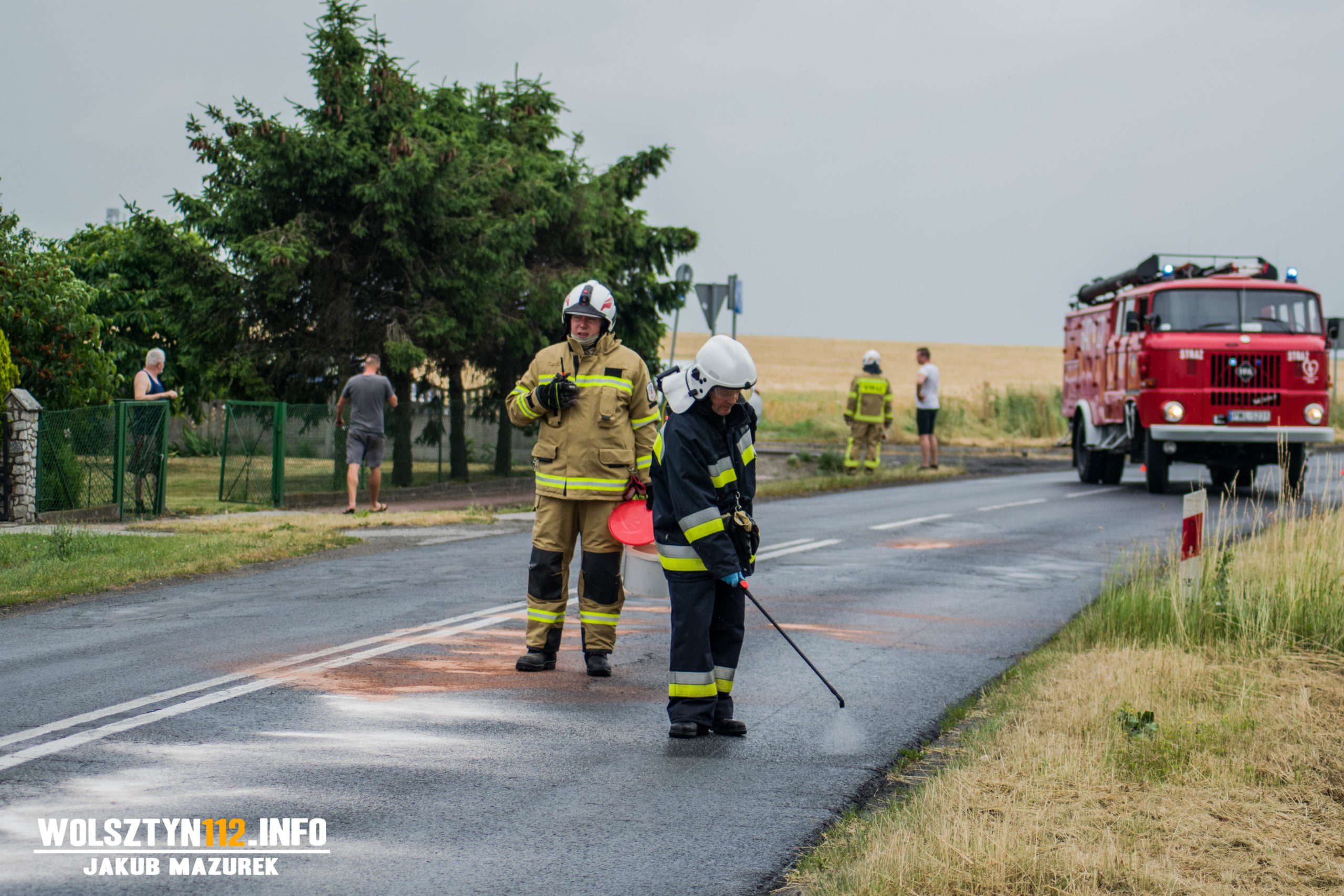 Do działań, niezwłocznie skierowano trzy zastępy z Jednostki Ratowniczo-Gaśniczej w Wolsztynie oraz po jednym zastępie ochotników z Wroniaw i Kębłowa, a także Zespół Ratownictwa Medycznego i patrol Policji. Po dotarciu we wskazane miejsce, zastano rozbity smaochód osobowy marki Mercedes po czołowym zderzeniu z samochodem ciężarowym. W wyniku zdarzenia, poszkodowany został kierujący osobówką doznając obrażeń kończyny dolnej. Mężczyźnie udzielona została kwalifikowana pierwsza pomoc po czym został przekazany ratownikom medycznym a następnie zabrany do wolsztyńskiego szpitala. Do działań zastępów na miejscu zdarzenia należało również usunięcie około 100-metrowej plamy substancji ropopochodnej, która to najprawdopodobniej przyczyniła się do zaistnienia zdarzenia. Na czas prowadzonych działań droga wojewódzka numer 305 była zamknięta, wobec czego wyznaczono objazdy. Swoje czynności na miejscu prowadzili również funkcjonariusze Policji.
