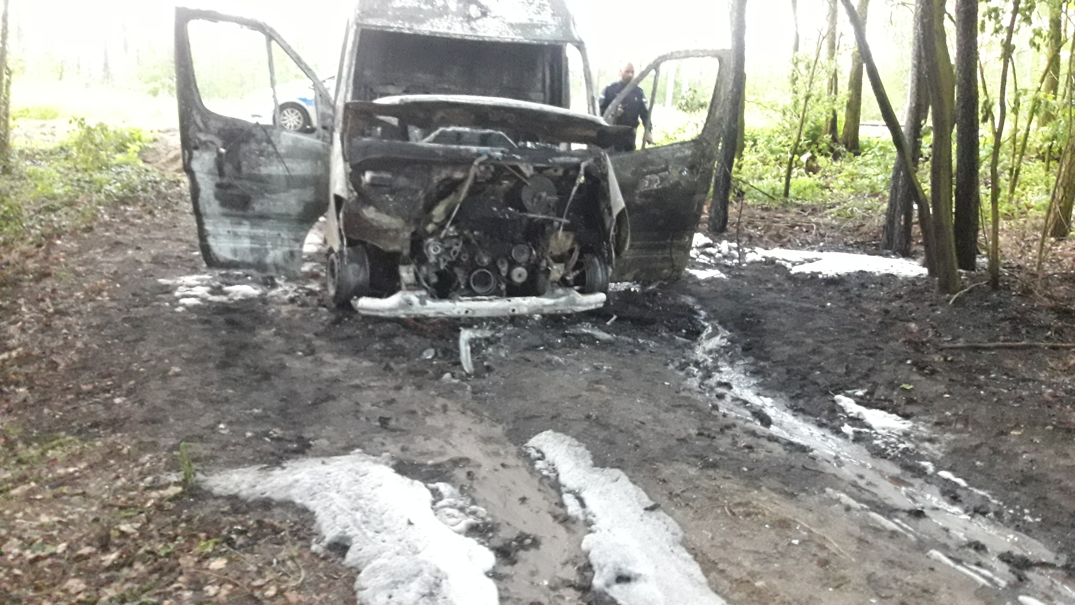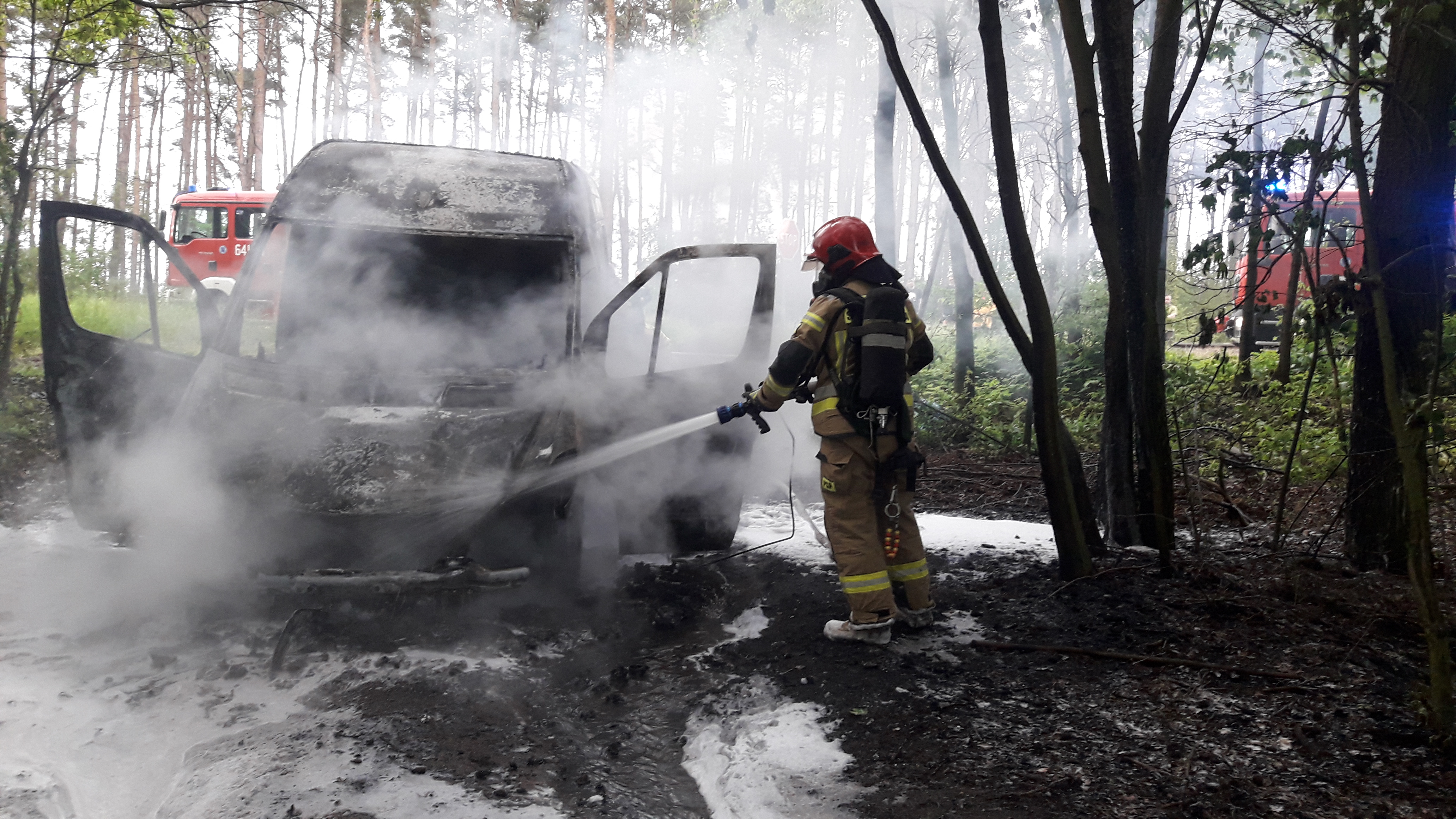 Dyżurny niezwłocznie zadysponował dwa zastępy z JRG Wolsztyn. Po ich przyjeździe na miejsce zdarzenia, zastano palący się samochód dostawczy Mercedes Sprinter na drodze polnej w lesie. Paliło się również poszycie leśne oraz drzewa znajdujące się w bliskiej odległości pojazdu. Na miejscu zdarzenia znajdowało się kobieta, która poinformowała dowódcę działań, że prawdopodobnie ktoś może znajdować w środku pojazdu.