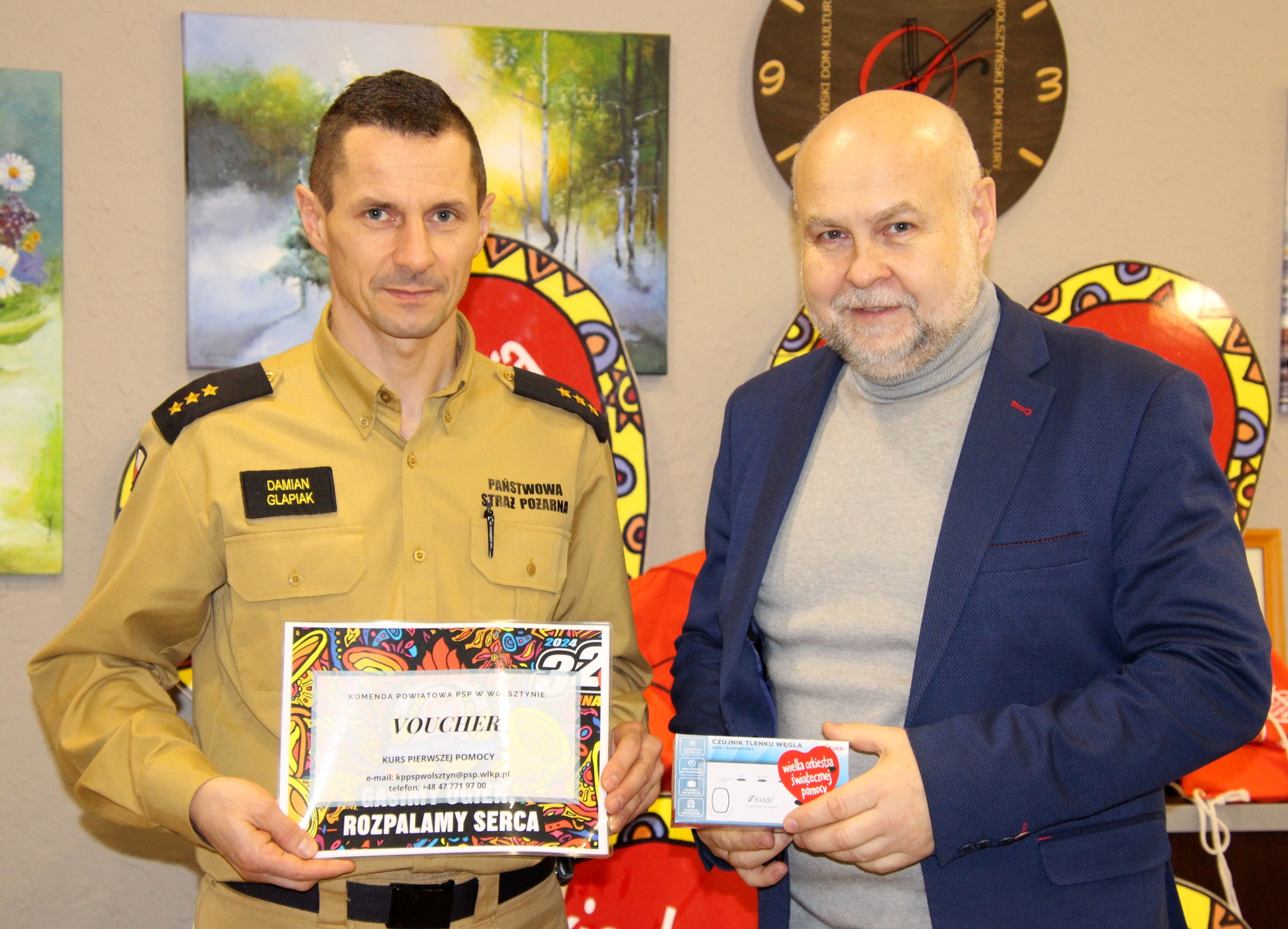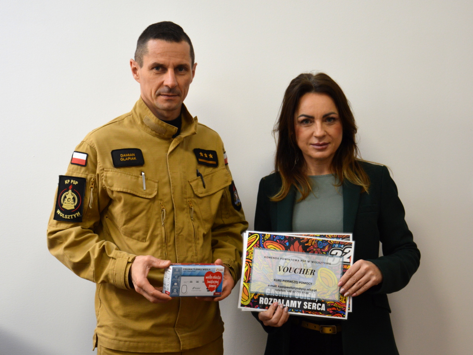 W ostatnich dniach kpt. Damian Glapiak – p.o. Komendanta Powiatowego Państwowej Straży Pożarnej w Wolsztynie przekazał vouchery oraz czujki tlenku węgla na 32 finał Wielkiej Orkiestry Świątecznej Pomocy, który w tym roku odbędzie się 28 stycznia 2024 r. Tegoroczny finał przebiega pod hasłem „Płucom po pandemii”.