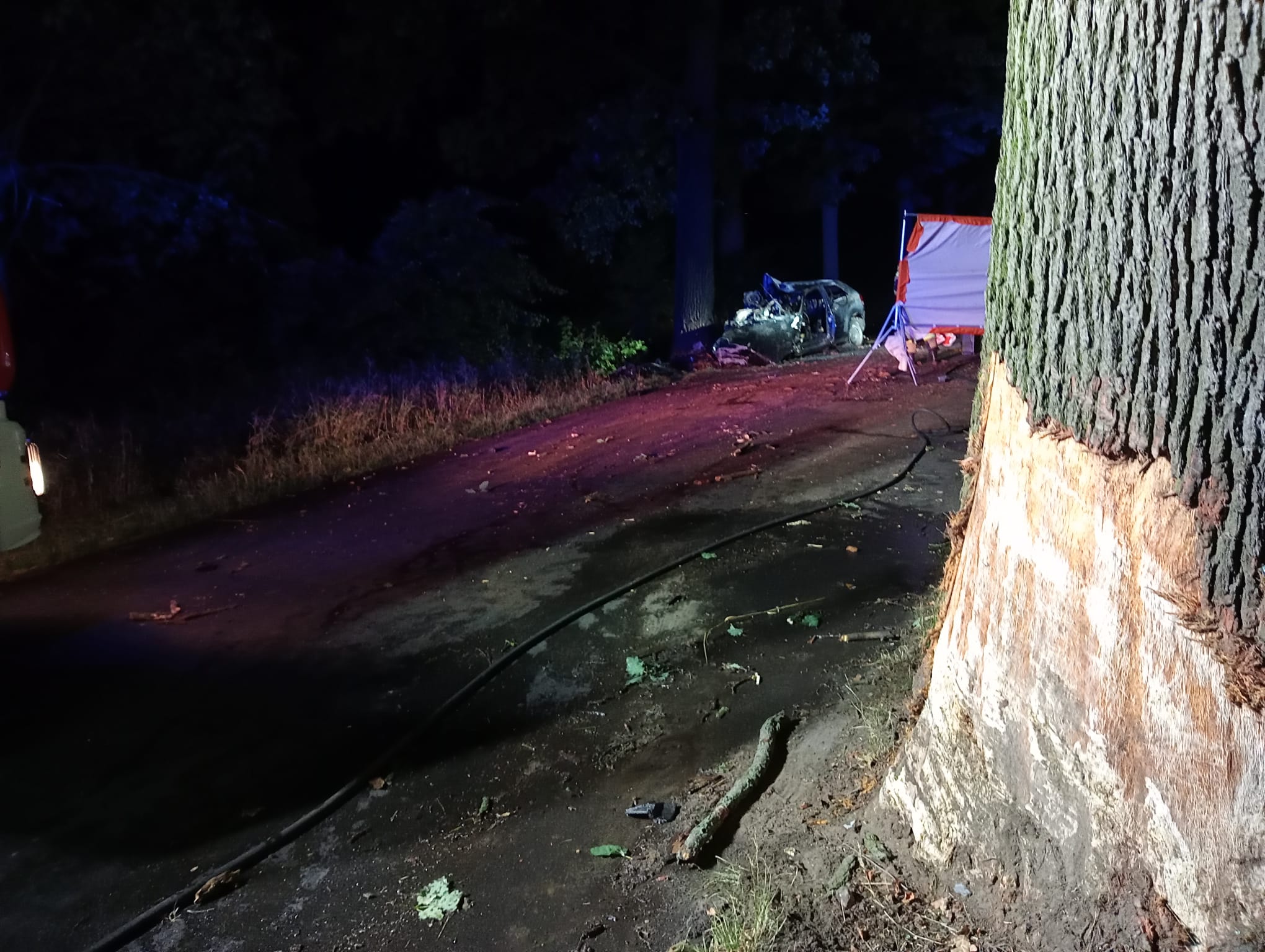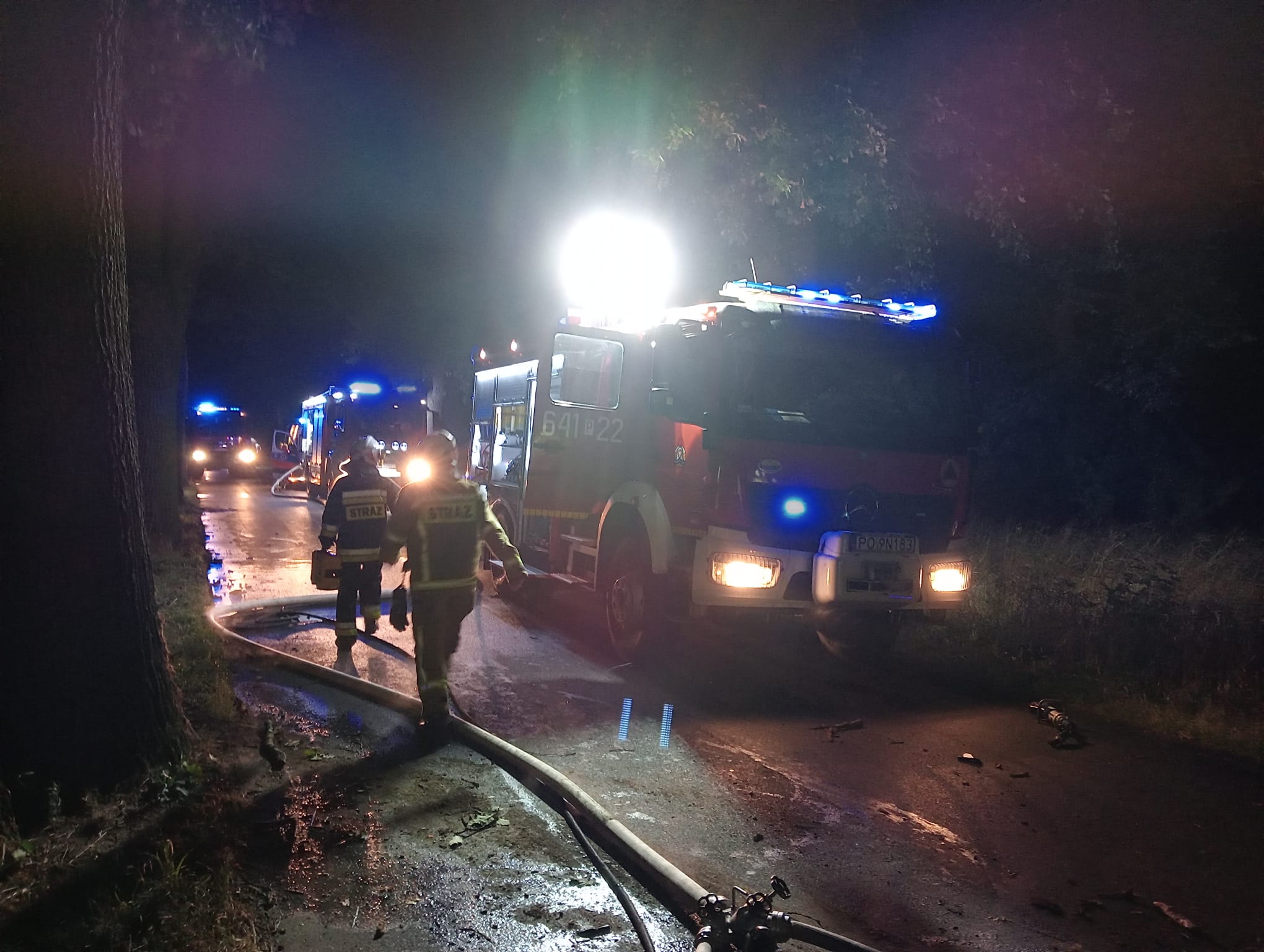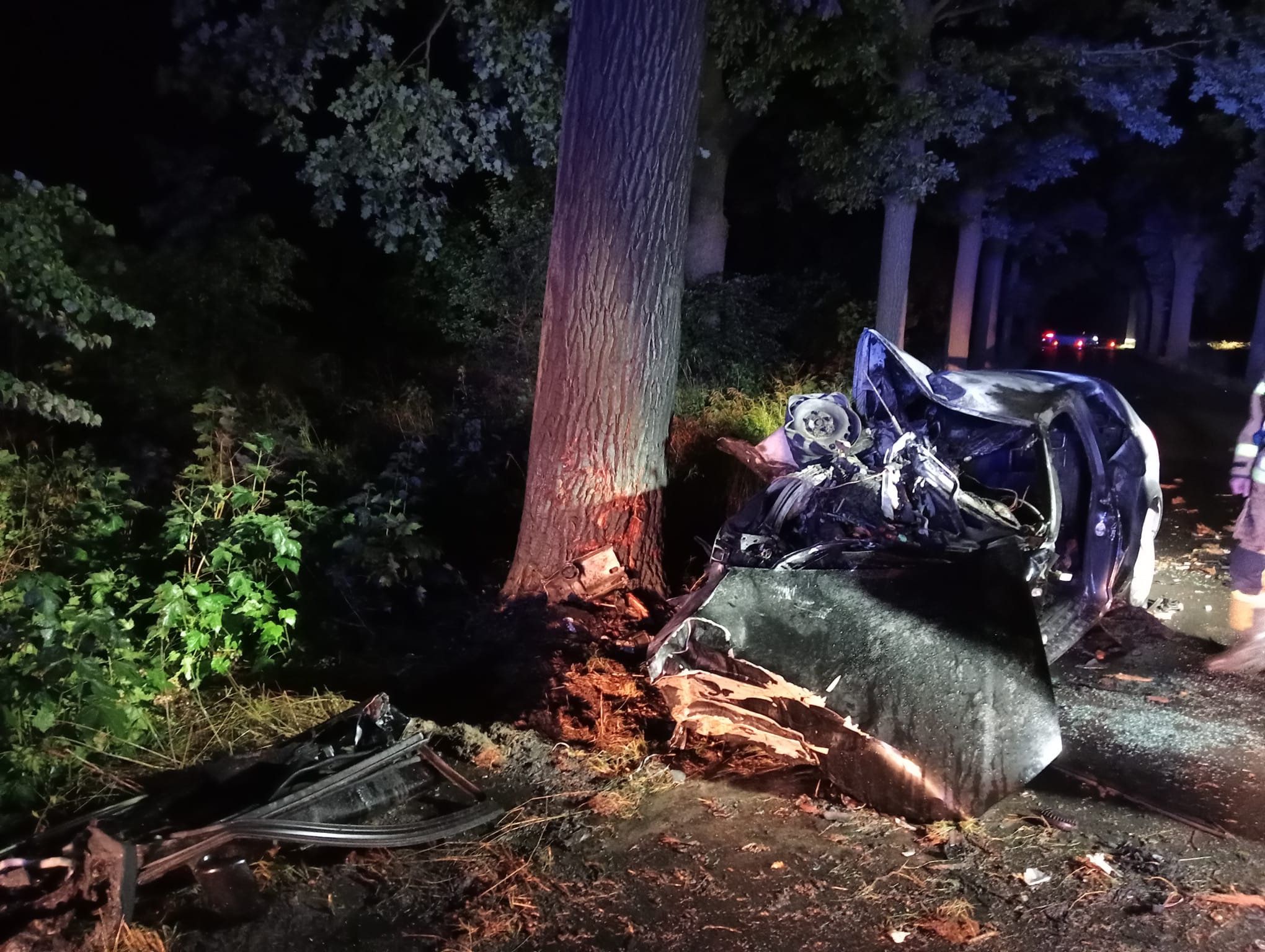 Zgłoszenie do Wolsztyńskich strażaków wpłynęło o godzinie 22.48, z wstępnych informacji ustalono, iż samochód osobowy uderzył w drzewo i uwięziony jest w nim mężczyzna. Oprócz dwóch wozów bojowych z Jednostki Ratowniczo-Gaśniczej do wypadku zadysponowano również jeden zastęp OSP Kębłowo oraz jeden zastęp OSP w Wroniawach. Już podczas dojazdu na miejsce zdarzenia przekazana została informacja, że samochód stanął w płomieniach. Po dojeździe na miejsca zdarzenia potwierdzono wcześniejsze informacje, zastano w pełni rozwinięty pożar samochodu, a w nim uwięzionego mężczyznę. Strażacy natychmiast przystąpili do akcji ratunkowej. Rozwinięto linię gaśniczą i podjęto próbę wydobycia mężczyzny z samochodu. Niestety mężczyzna okazał się być przygnieciony przez elementy pojazdu, dlatego natychmiastowe wyciągnięcie mężczyzny okazało się być niemożliwe. Po wstępnym ugaszeniu pojazdu przy pomocy sprzętu burzącego oraz hydraulicznego dokonano dostępu do poszkodowanego i ewakuowano go na zewnątrz samochodu. Lekarz przybyły na miejsce stwierdził zgon mężczyzny. Dalsze działania zastępów polegały na zabezpieczeniu miejsca zdarzenia przed osobami postronnymi, oświetleniu miejsca zdarzenia, aż do momentu przeprowadzenia wszystkich czynności dochodzeniowych. Po przetransportowaniu wraku samochodu oraz ciała mężczyzny strażacy uprzątnęli miejsce zdarzenia oraz zneutralizowali wycieki. Podczas prowadzenia działań ruch został całkowicie zablokowany. Okoliczności zdarzenia wyjaśnia Policja pod nadzorem Prokuratury.