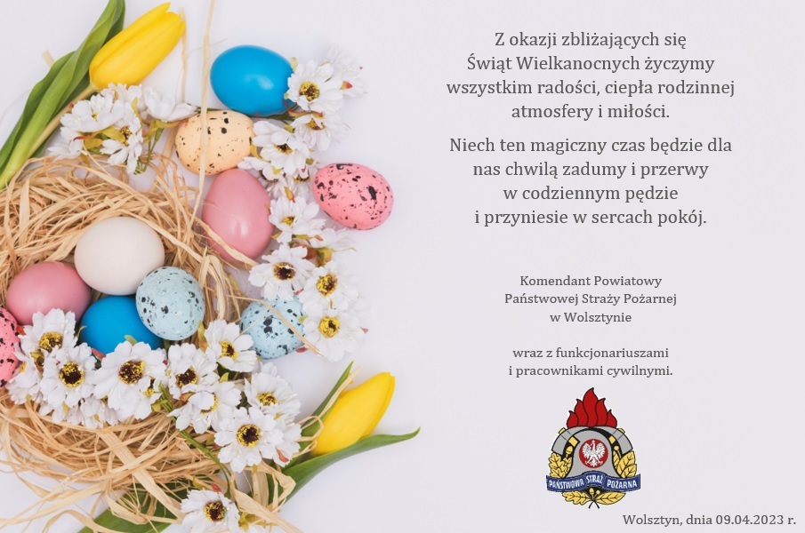 ŻYCZENIA WIELKANOCNE KOMENDANTA POWIATOWEGO PSP W WOLSZTYNIE 09.04.2023 Zdjęcia (1) Pokaż zdjęcie 1 z galerii.
