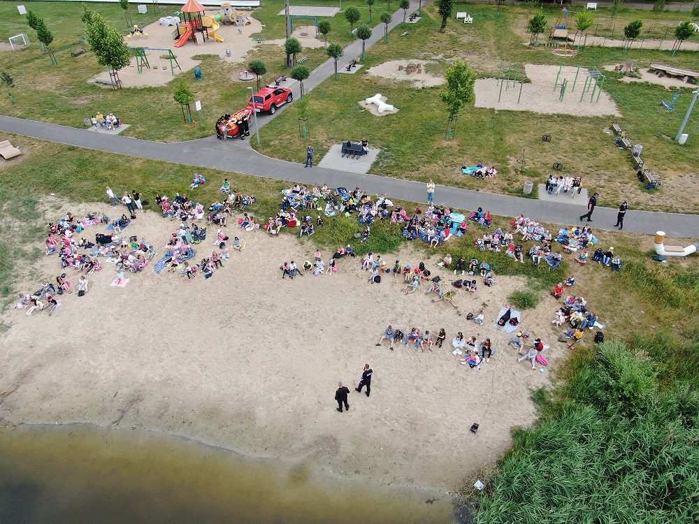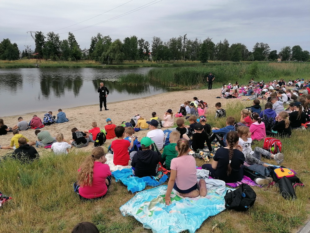 Wrzesińskie służby mundurowe zorganizowały dla uczniów klas 0-3 profilaktyczne, plenerowe zajęcia nad Zalewem Lipówka. Omówione zostały tematy widziane z perspektywy pieszego, rowerzysty oraz miłośnika plażowania.