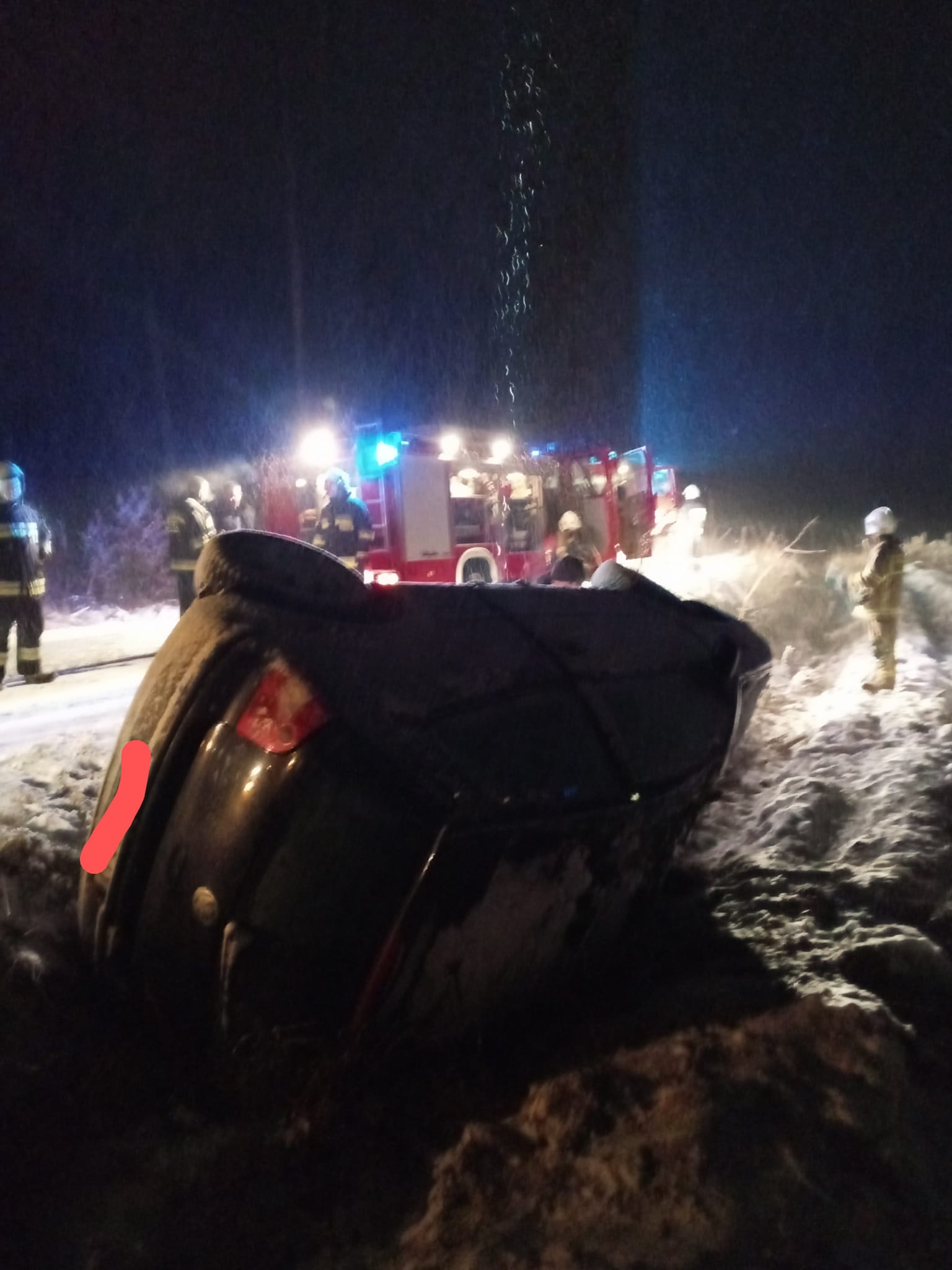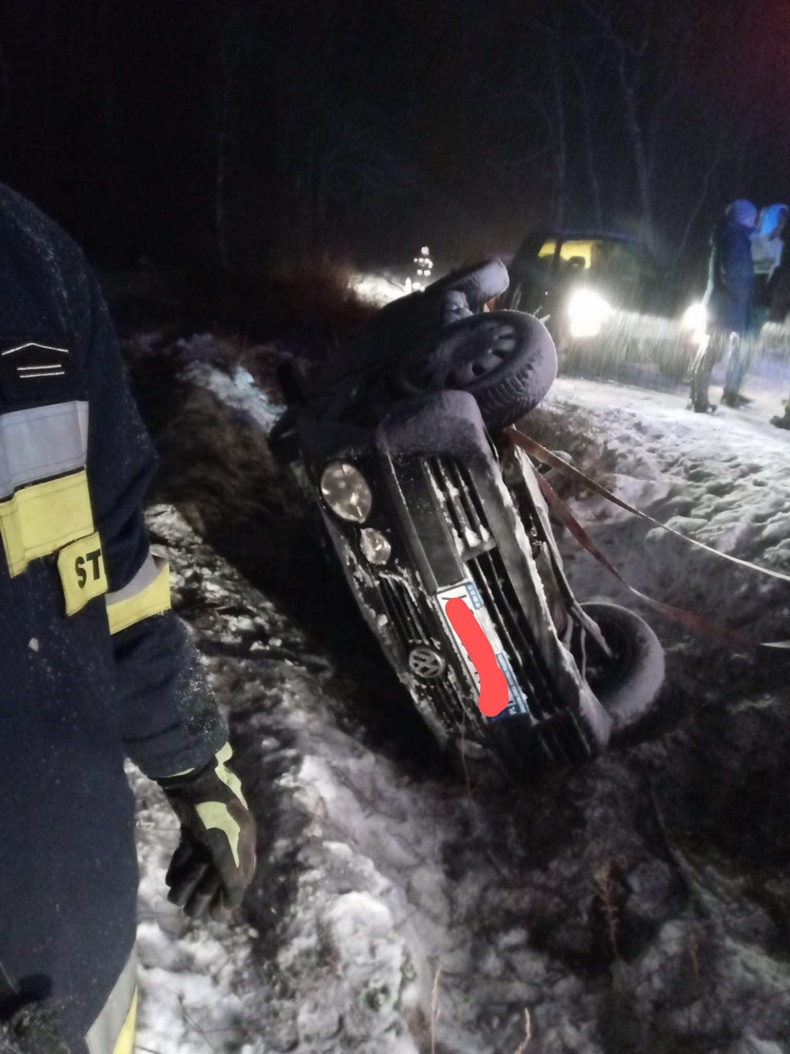 Po dojeździe na miejsce wypadku zastano zastano samochód leżący na prawym boku w rowie, brak osób podróżujących. Działania polegały na zabezpieczeniu miejsca zdarzenia, oświetleniu i przeszukaniu terenu pod kątem obecności osób poszkodowanych (nie stwierdzono obecności). Jednocześnie odłączono akumulator w pojeździe.