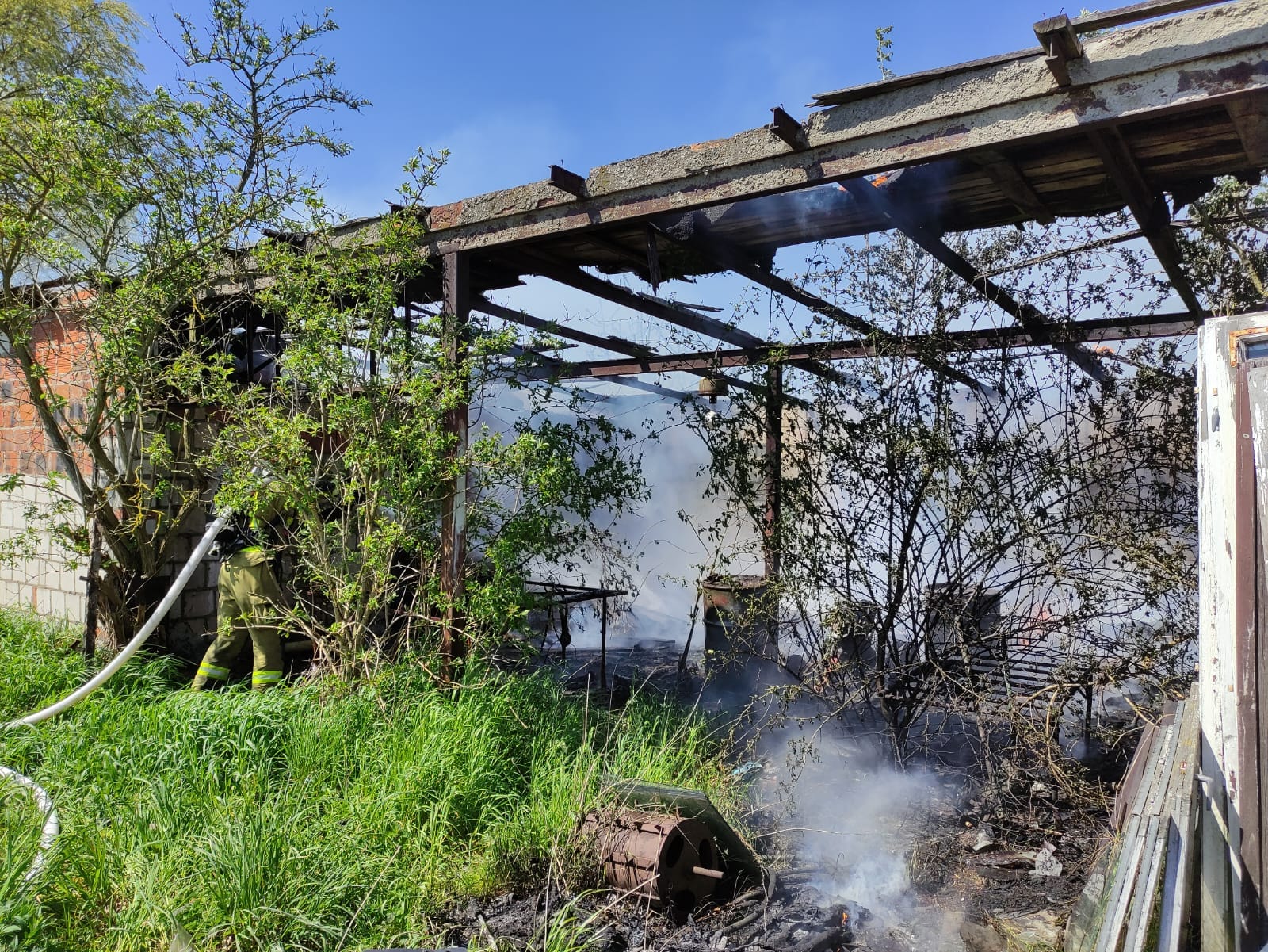 Po dojeździe na miejsce zastano pożar dachu budynku gospodarczego; obiekt wolnostojący nie stwarzał zagrożenia dla innych budynków. Pożar obejmował pół budynku. Konstrukcja murowana, dach odeskowany pokryty papą.
