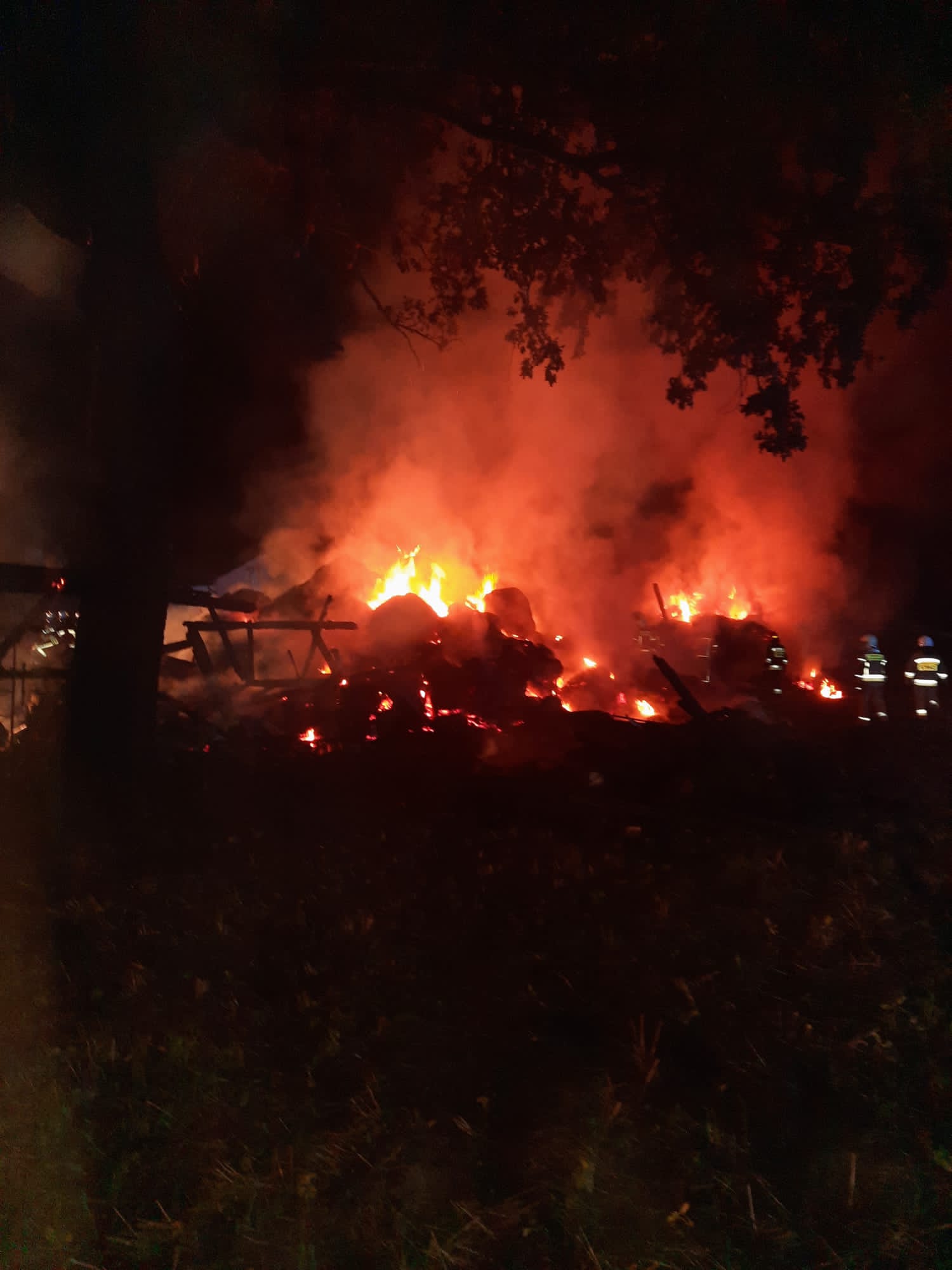 W dniu 23 sierpnia 2023r. o godz. 20:08 wpłynęło zgłoszenie do SKKP we Wrześni o pożarze stodoły w miejscowości Ciemierów- Kolonia gm. Pyzdry. Po przybyciu na miejsce zdarzenia zastano budynek gospodarczy stodoła całkowicie objętą pożarem. Ściany budynku oraz konstrukcja dachu drewniana pokryta eternitem. W budynku znajdowało się ok. 150 szt. balotów słomy oraz 80 szt. balotów siana. Ponadto do stodoły przylegał drewniany budynek gospodarczy także objęty pożarem. Działania straży pożarnej polegały na zabezpieczeniu miejsca zdarzenia, sprawdzeniu napięcia elektrycznego w budynku za pomocą detektora oraz podzieleniu terenu na dwa odcinki bojowe: