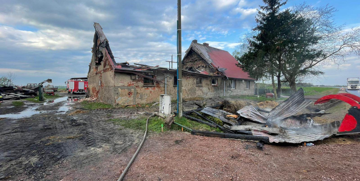 Po dojeździe na miejsce zastano pożar dachu budynku inwentarskiego sąsiadującego z budynkiem mieszkalnym. Wewnątrz znajdowało się 12 sztuk bydła. 4 mieszkańców ewakuowało się przed przybyciem jednostek straży pożarnej.