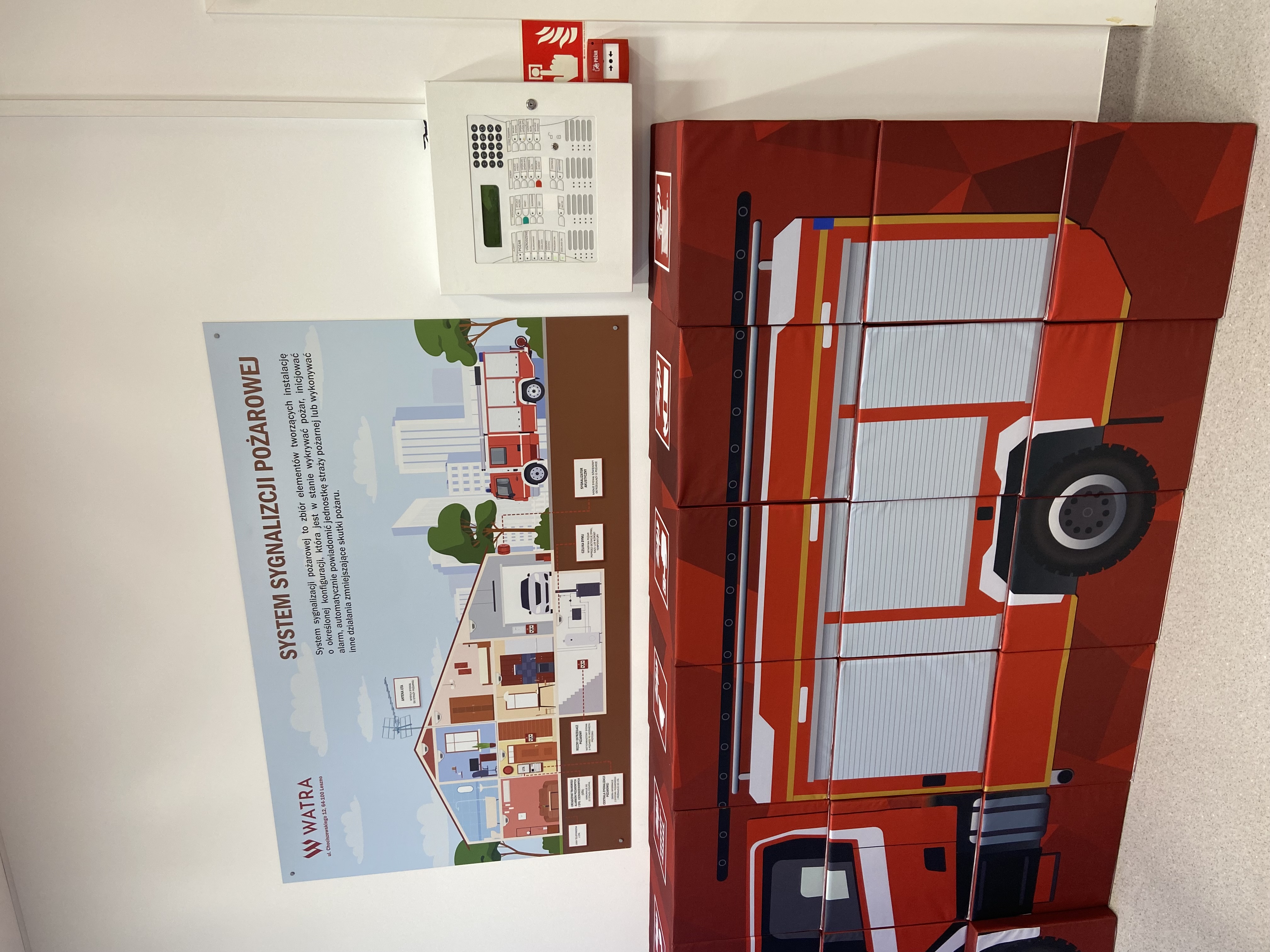 W skład wyposażenia elektroniczno- mechanicznego Sali wchodzą m.in.: moduł pożaru oleju na patelni, imitacja mikrofalówki, moduł ogniska w lesie, fototapeta z wizualizacją „zdrowego” lasu, moduł segregacji śmieci, moduł jeziora w scenerii zimowej oraz letniej, fototapeta ze znakami ostrzegawczymi, moduł łazienki, atrapa czujki czadu, mini wóz strażacki z sygnalizacją świetlną i dźwiękową, System Sygnalizacji Pożarowej.