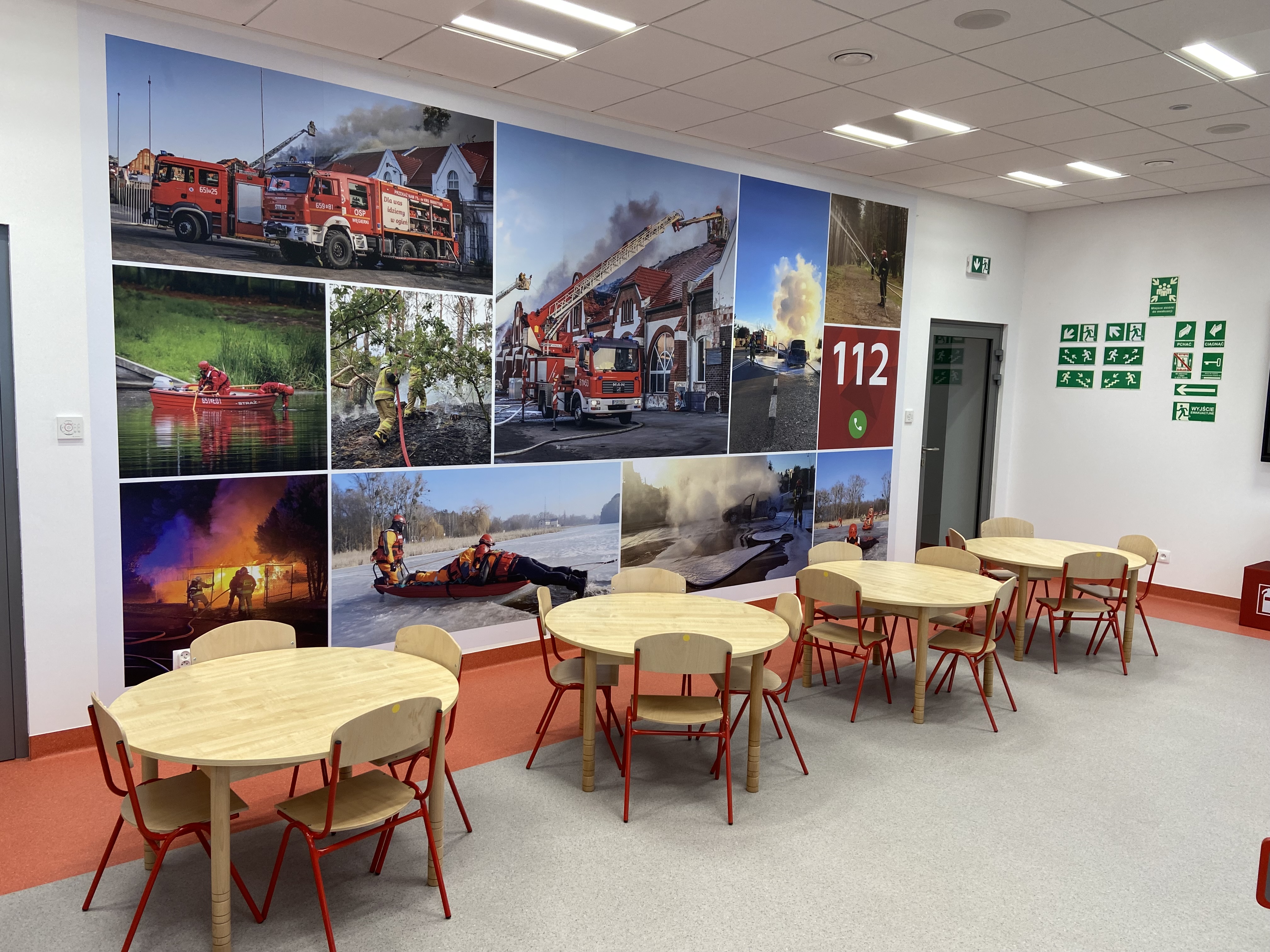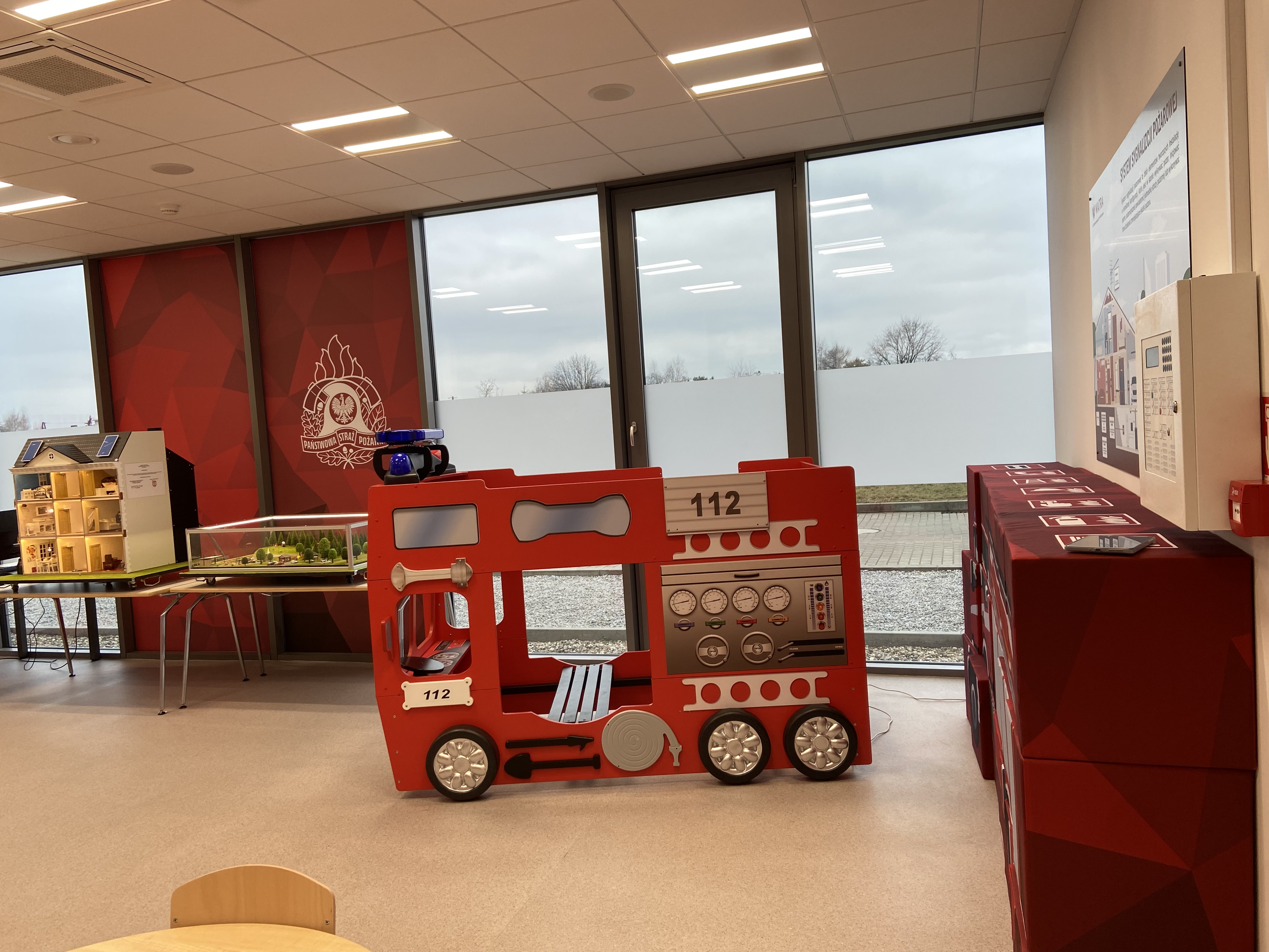 Sala Edukacyjno- Szkoleniowa to miejsce w którym strażacy Państwowej Straży Pożarnej prowadzą zajęcia dla dzieci dotyczące szeroko rozumianego bezpieczeństwa. Spotkania odbywają się z wykorzystaniem sprzętu multimedialnego, symulatorów zagrożeń, a także rzeczywistych scenek.