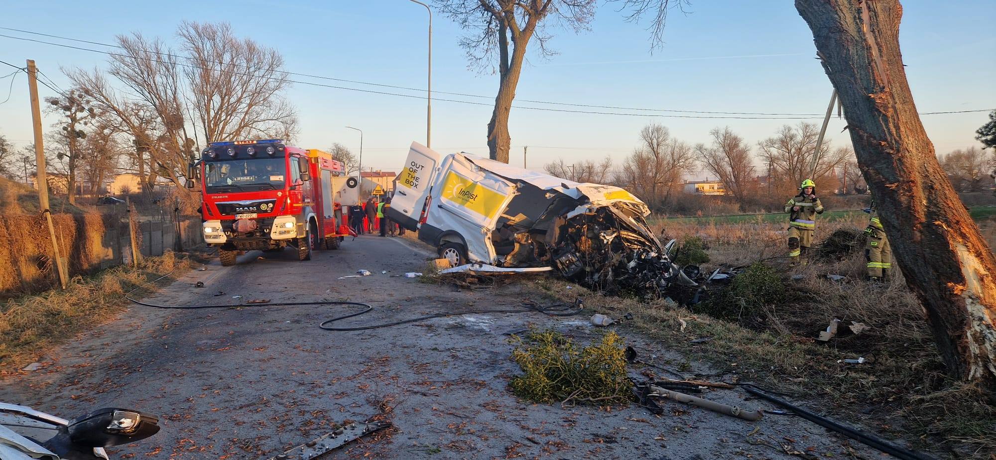 Strażacy po dotarciu na miejsce zastali samochód bus po uderzeniu w drzewo. Ratownicy Zespołu Ratownictwa Medycznego prowadzili resuscytację krążeniowo- oddechową u poszkodowanego mężczyzny.