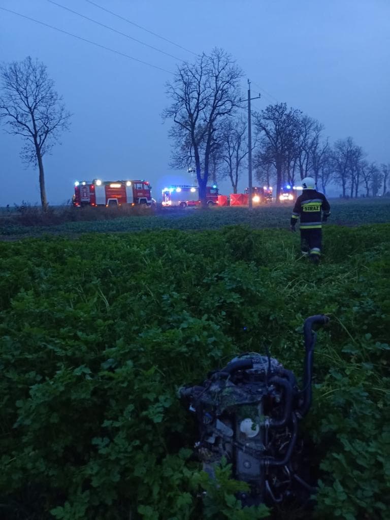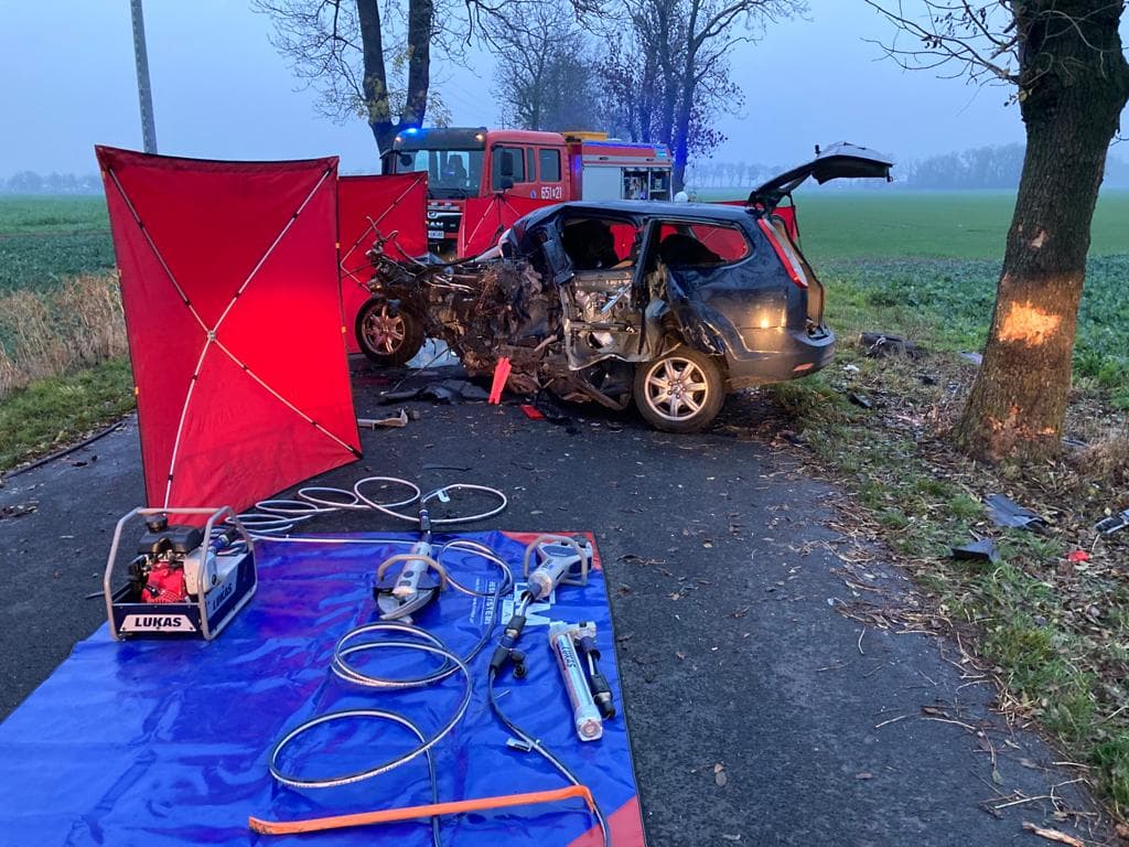 Po przyjeździe na miejsce wypadku zastano samochód osobowy, który wcześniej uderzył w drzewo. W pojeździe znajdowała się jedna osoba. Droga całkowicie zablokowana.
