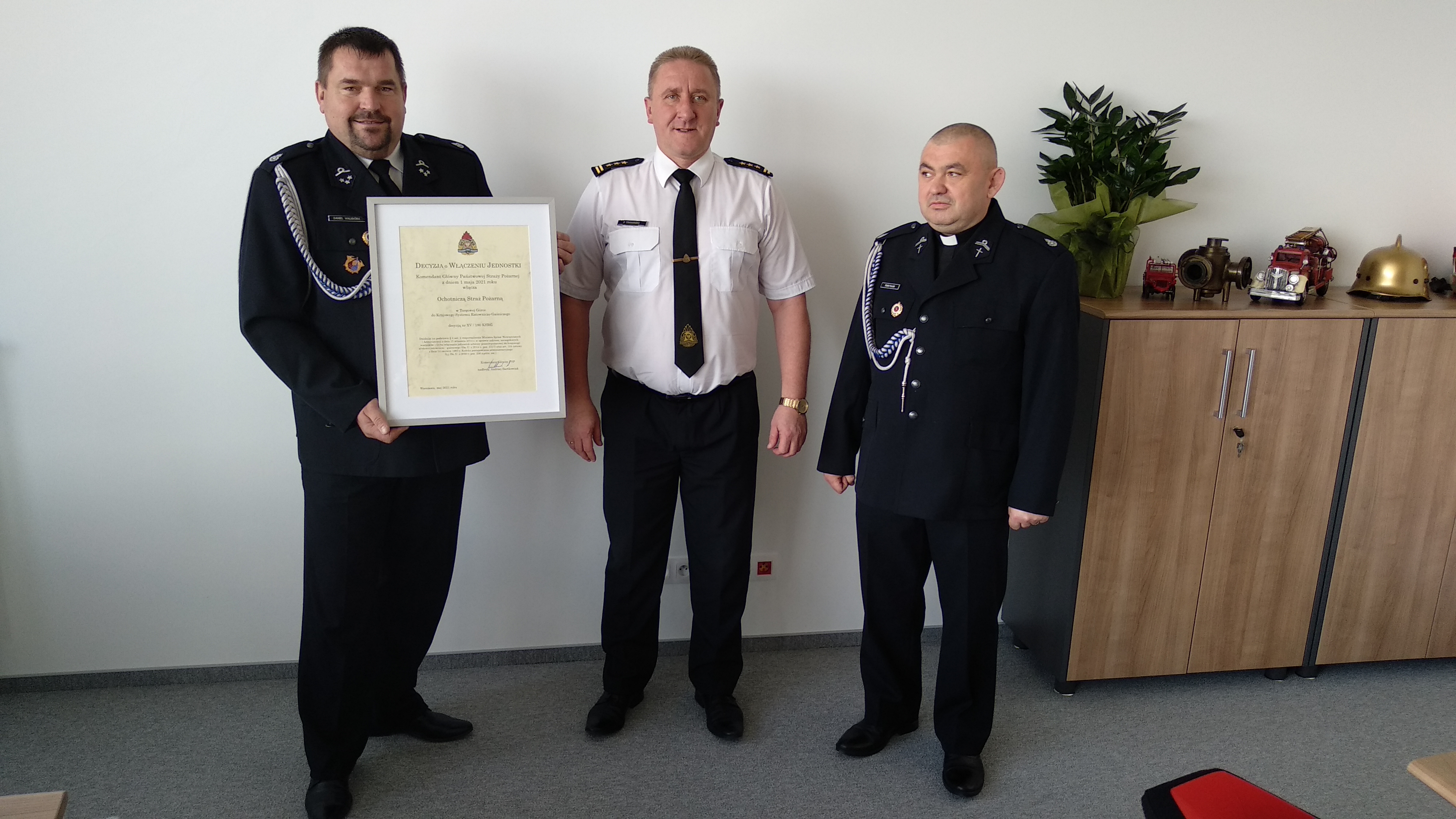 6 maja w siedzibie Komendy Powiatowej PSP we Wrześni doszło do wręczenia Decyzji Komendanta Głównego PSP o włączeniu OSP Targowa Górka do Krajowego Systemu Ratowiczo- Gaśniczego. Decyzję z rąk Komendanta Powiatowego PSP we Wrześni st. bryg. Piotra Trawińskiego odebrali: druh Daniel Waligóra- naczelnik OSP Targowa Górka oraz kapelan gminny nekielskich strażaków ks. Rafał Hordik.