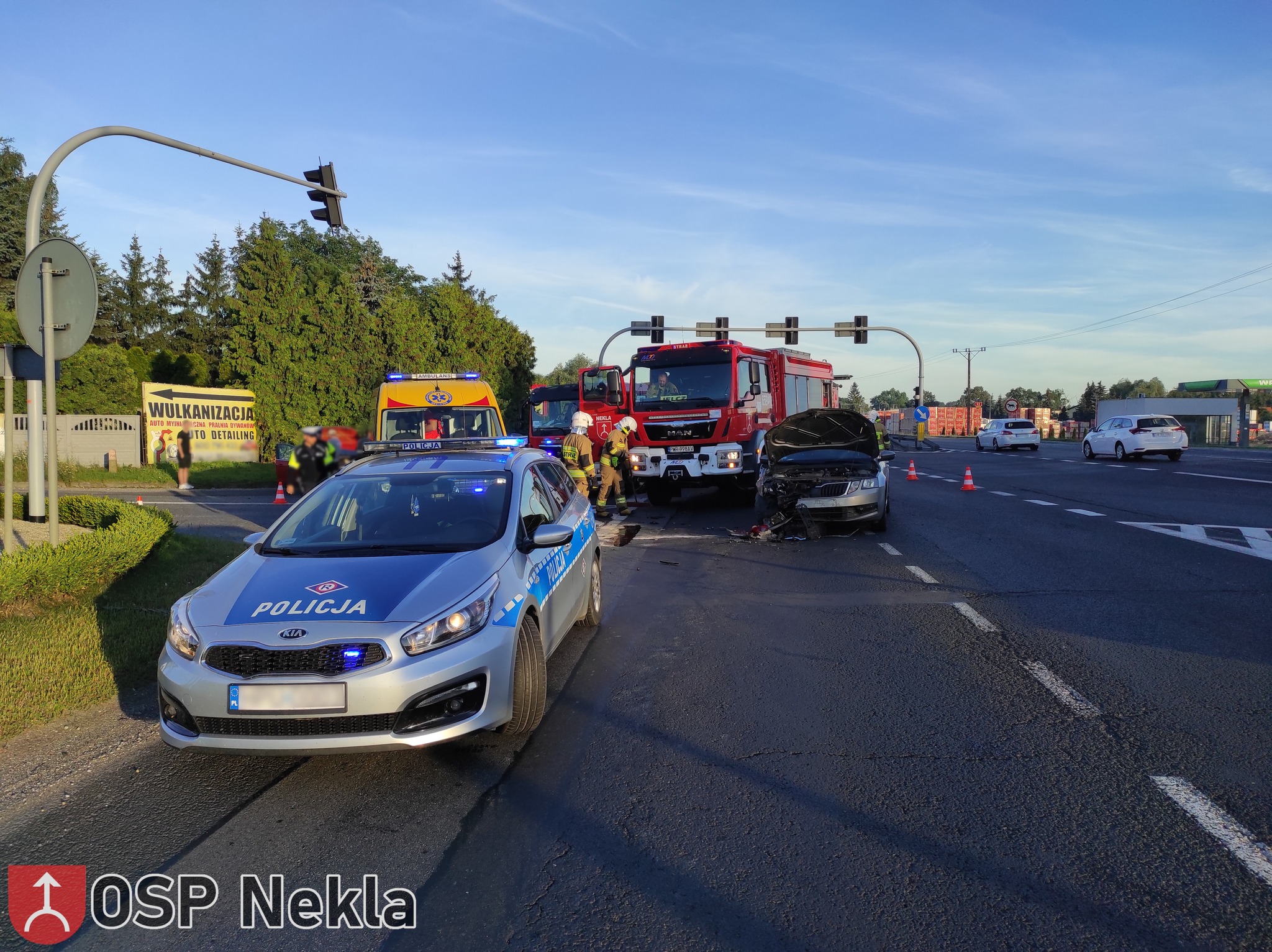 Po przybyciu na miejsce zdarzenia pierwszego zastępu (GBA OSP Nekla) zastano dwa samochody osobowe (Skoda Octavia, Peugeot 208) znajdujące się na skrzyżowaniu dróg po zderzeniu.