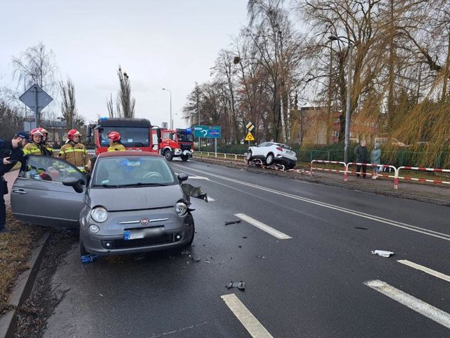 Po dojeździe na miejsce strażacy zastali dwa samochody osobowe po zderzeniu. Jeden pojazd znajdował się na jezdni, drugi na barierkach oddzielających jezdnię od chodnika. Pojazdami podróżowali kierowcy.