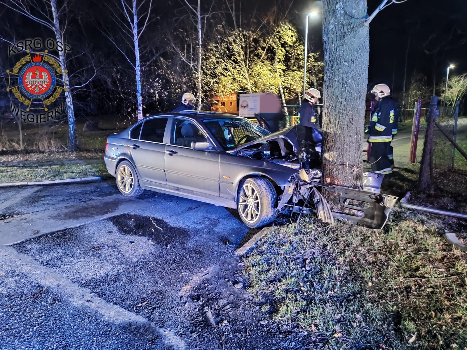Po dojeździe na miejsce wypadku zastano samochód osobowy po uderzeniu w drzewo. Cztery osoby podróżujące pojazdem znajdowały się na zewnątrz. Działania polegały na zabezpieczeniu miejsca zdarzenia, udzieleniu kpp dwóm osobom poszkodowanym i odłączeniu instalacji elektrycznej w samochodzie. Osoby poszkodowane zostały przetransportowane przez ZRM do Szpitala Powiatowego we Wrześni.